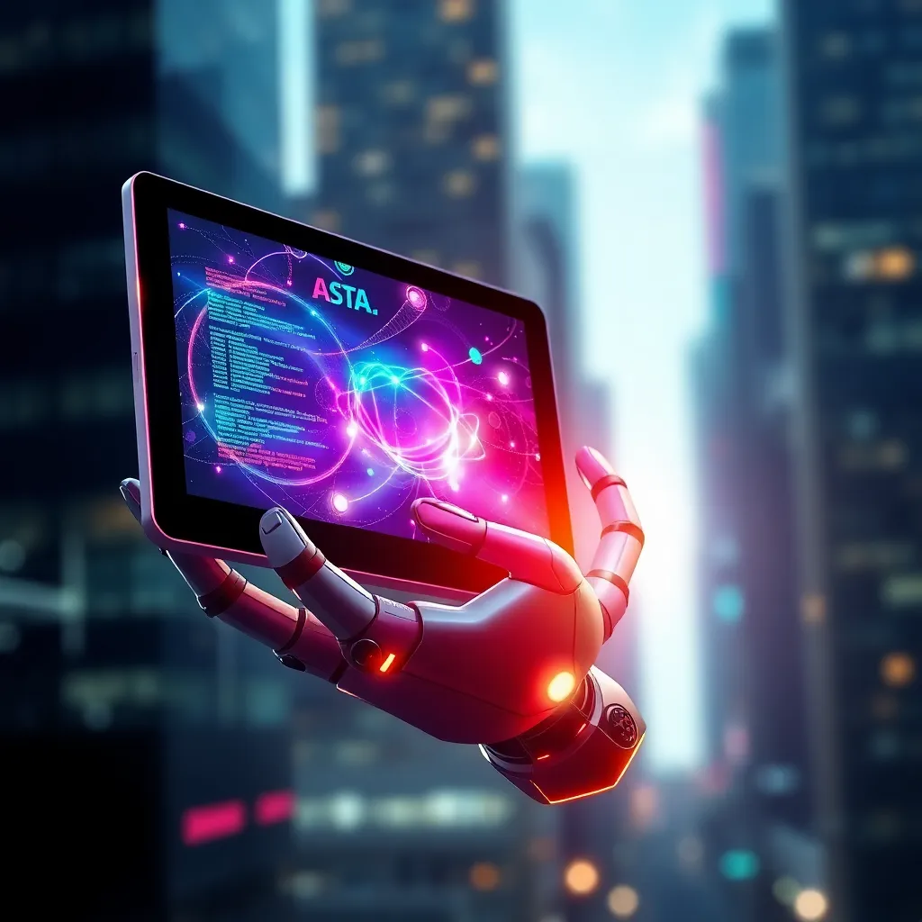 Create a futuristic AI concept image showcasing a sleek, glowing robot arm holding a tablet displaying a mesmerizing animation of swirling data clouds and code snippets. Incorporate vibrant colors and neon lights to convey innovation, technology, and limitless possibilities. The background should be a blurred cityscape with towering skyscrapers.