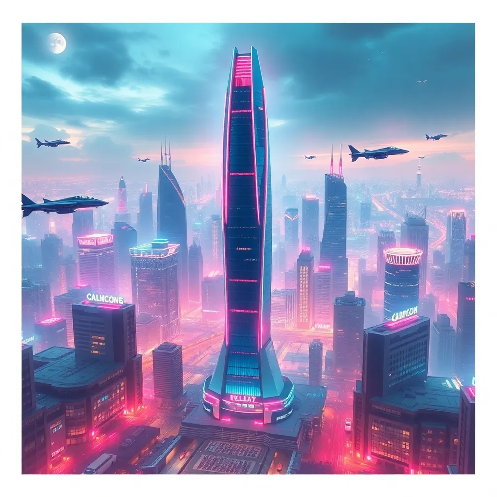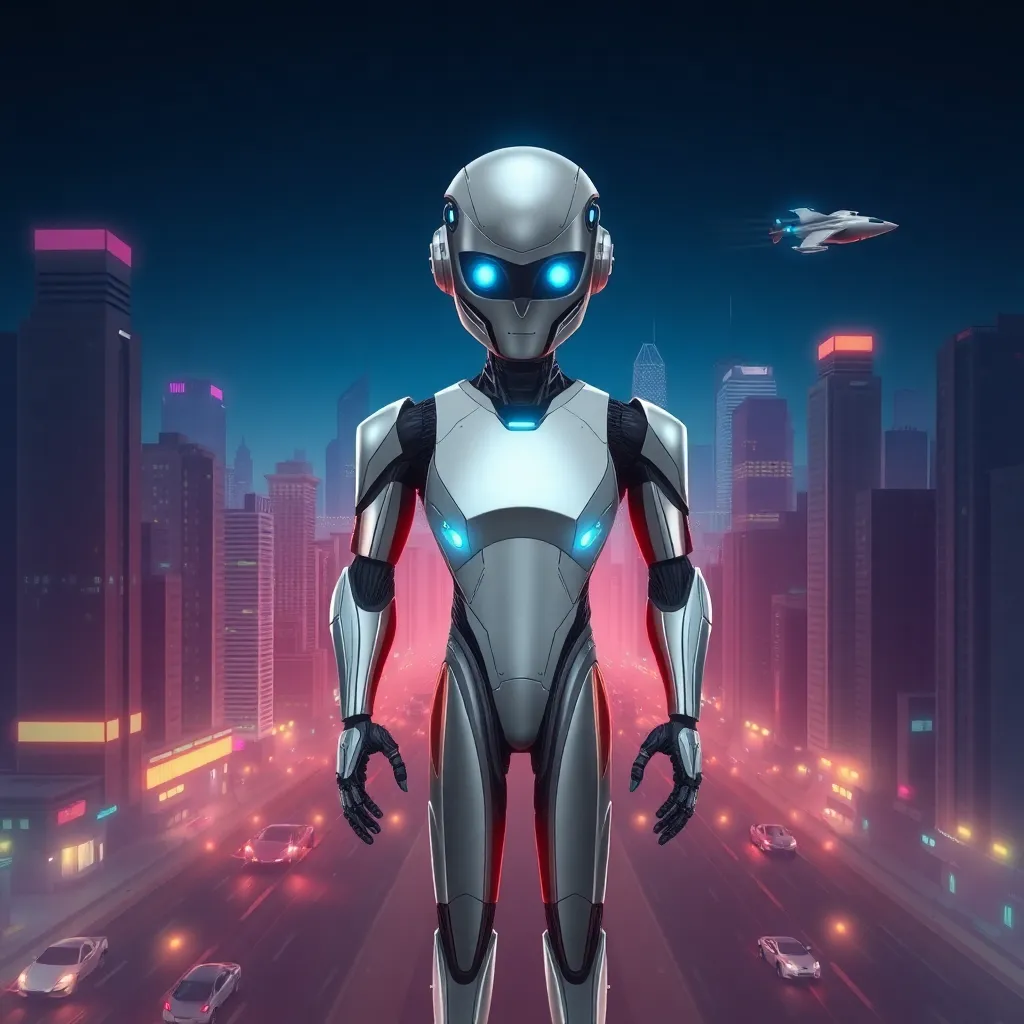 Create a futuristic cityscape with a sleek, high-tech skyscraper in the center, surrounded by a bustling metropolis with flying cars and robots. Incorporate a vibrant color scheme with neon lights and a sense of excitement and innovation. Use AI-generated imagery to bring this futuristic world to life.