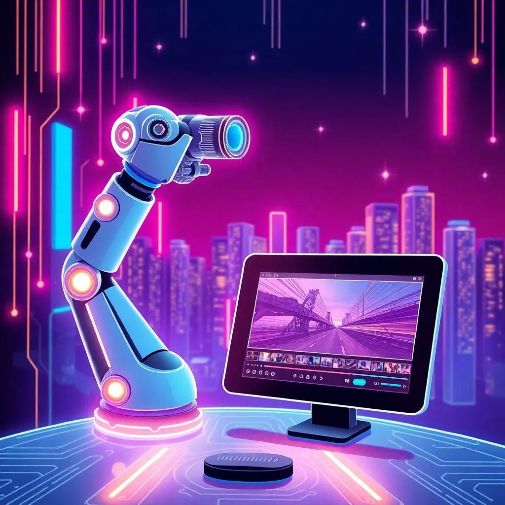 Create a futuristic illustration of a cutting-edge AI video maker tool. Depict a sleek, glowing interface with a robotic arm holding a camera and a tablet displaying a video editing timeline. Incorporate neon lights, circuit boards, and a cityscape in the background to convey innovation and creativity.