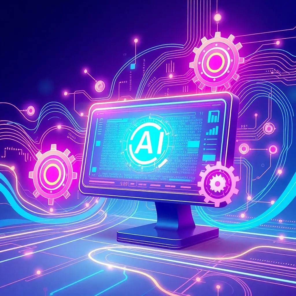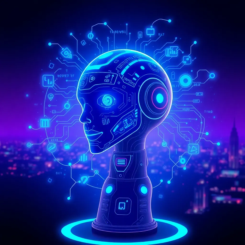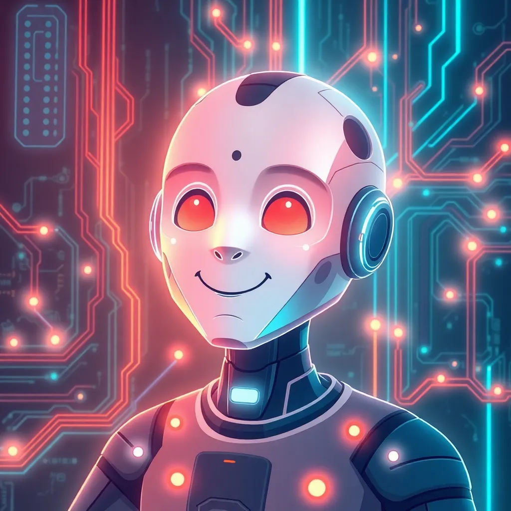 Create a futuristic illustration of a smart AI assistant, surrounded by glowing circuit boards, wires, and microchips. The AI should be depicted as a friendly, approachable figure with a warm smile, conveying reliability and trustworthiness. Incorporate subtle animations and neon lights to give the image a dynamic, high-tech feel.