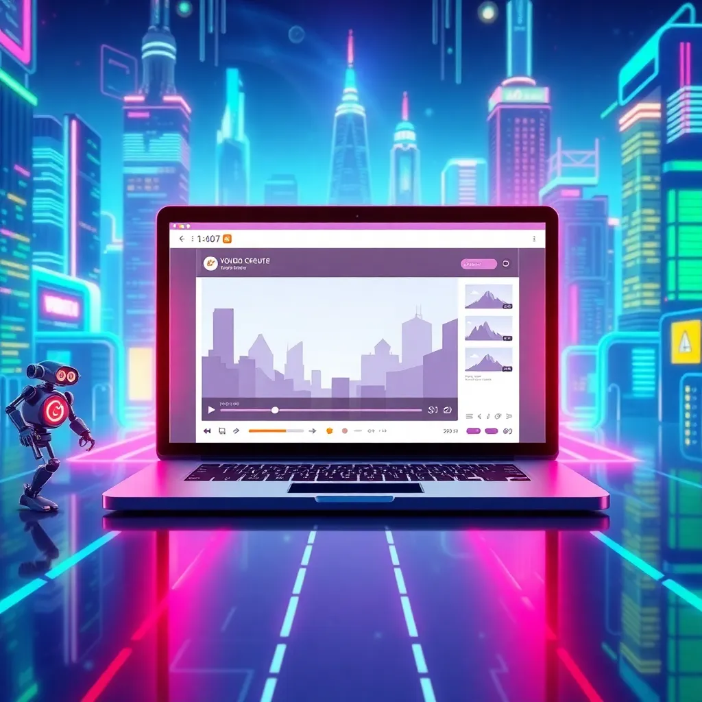 Create a futuristic and sleek animation showcasing a innovative AI video maker tool. The image should feature a futuristic cityscape with a laptop or tablet displaying a video creation interface. Incorporate neon lights, robots, and coding symbols to convey the tool's cutting-edge technology and creative capabilities.