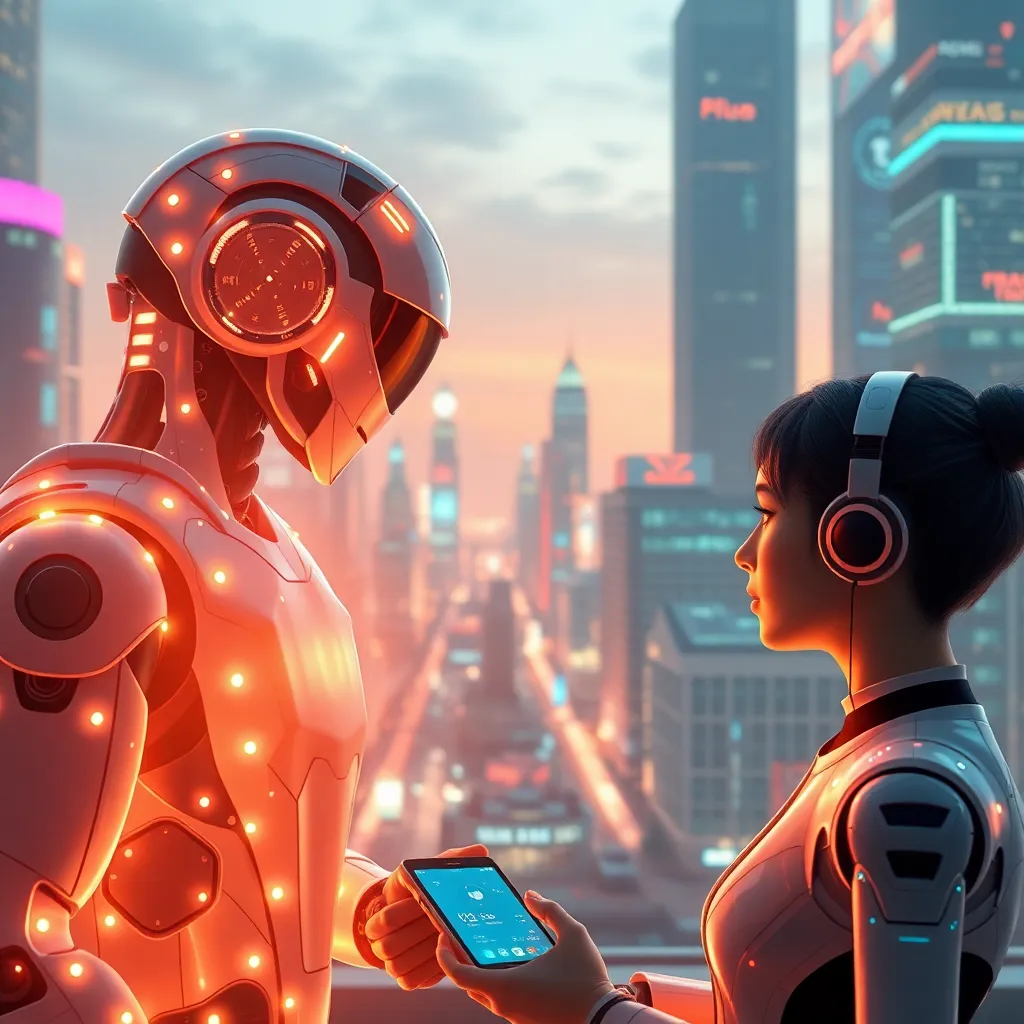 Create a futuristic AI promo video showcasing a sleek, glowing interface. The background should feature a cityscape at dawn, with AI-powered robots and drones flying overhead. Incorporate vibrant neon lights and a dynamic soundtrack to convey innovation and progress. The main focus should be on the AI's ability to enhance human life.