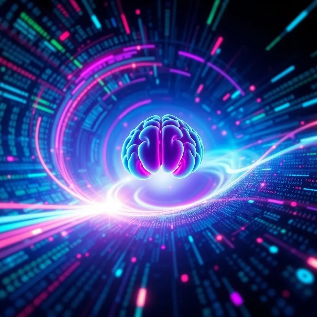 Create a futuristic and vibrant image for a cutting-edge AI video promo. Depict a swirling vortex of code and lights, with a glowing AI brain at the center. Incorporate neon hues and abstract shapes to convey innovation and intelligence. The image should be visually striking and attention-grabbing, perfect for social media promotion.