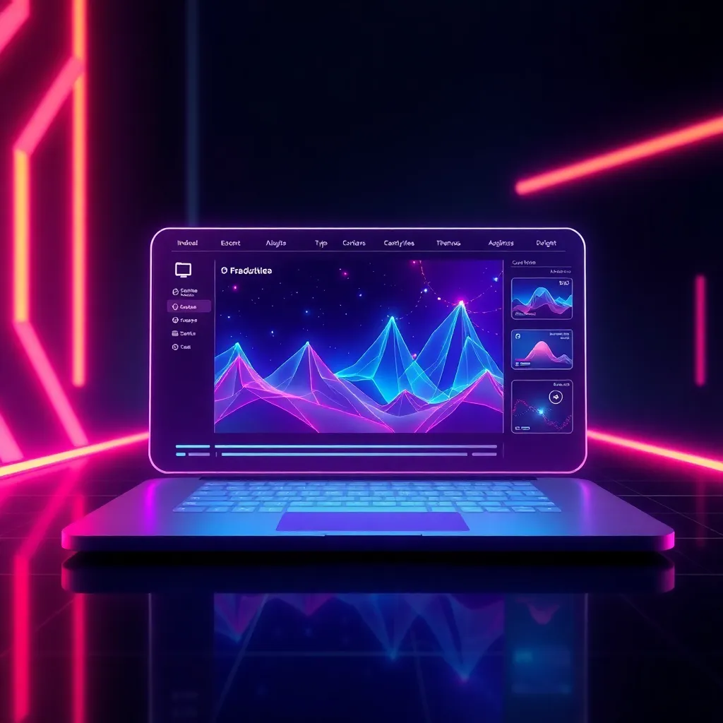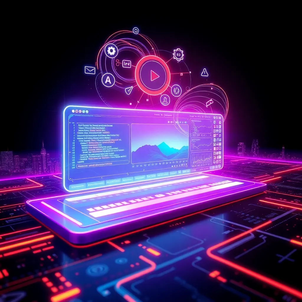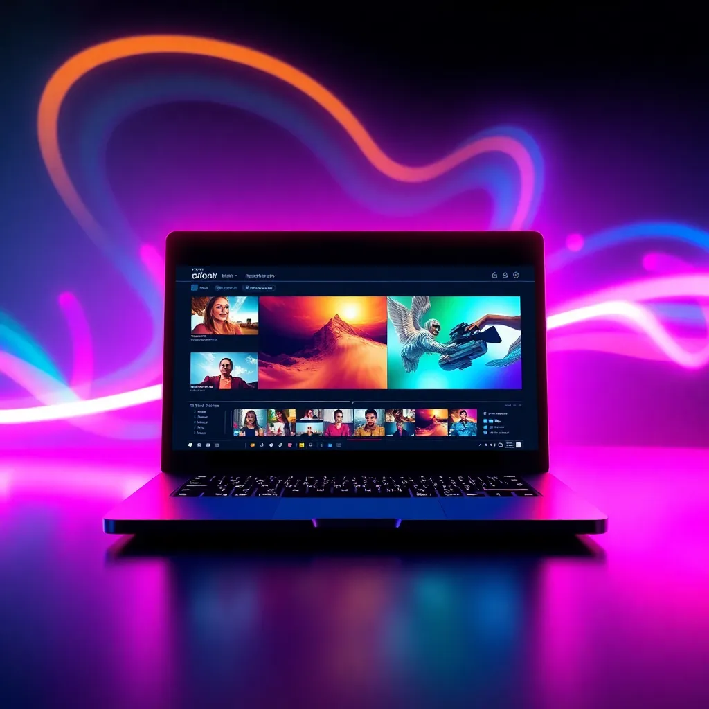 Create a futuristic and sleek animation for a new AI-powered video editing software. The image should feature a glowing laptop screen displaying a montage of vibrant video clips, with AI-generated effects and transitions in the background. Incorporate neon colors and dynamic shapes to convey innovation and creativity.