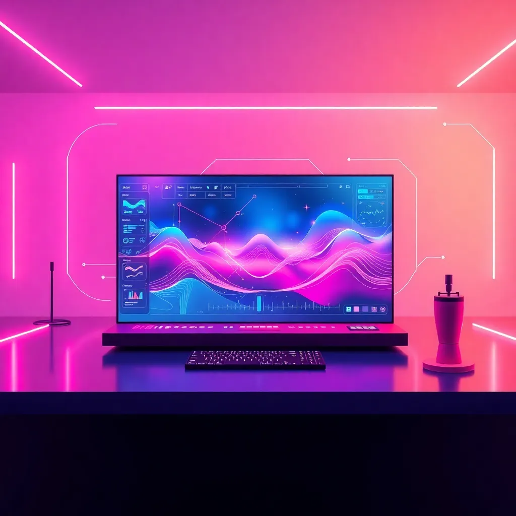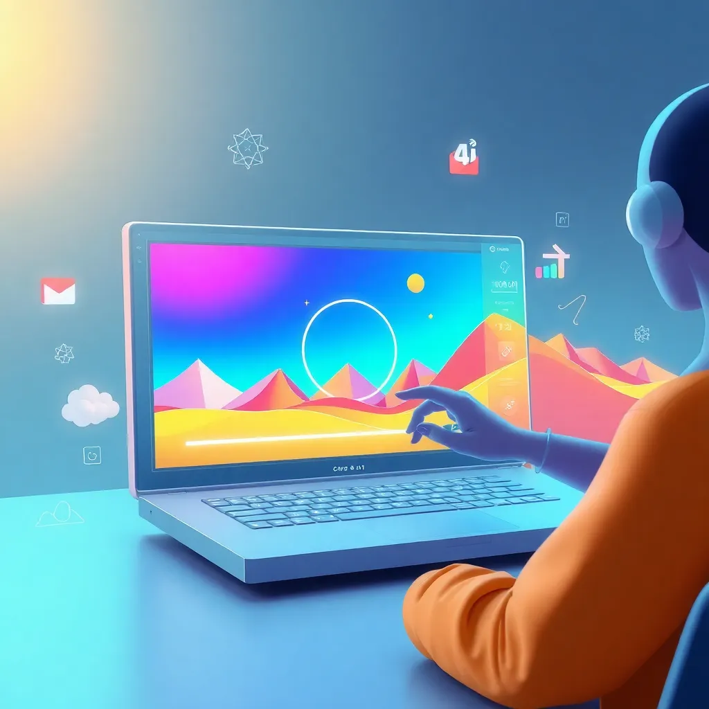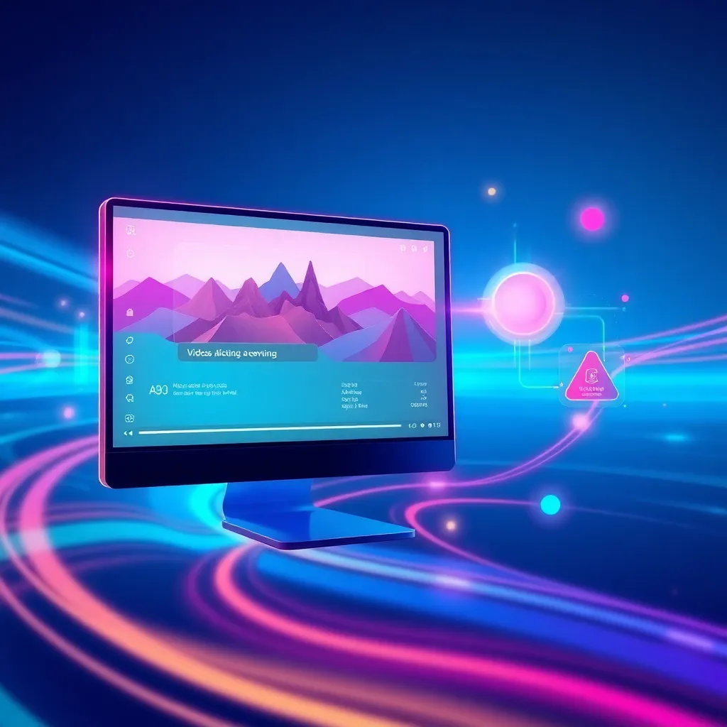 Create a futuristic and sleek animation for a new AI-powered video editing software. The image should feature a glowing laptop screen displaying a montage of vibrant video clips, with AI-generated effects and transitions in the background. Incorporate neon colors and dynamic shapes to convey innovation and creativity.