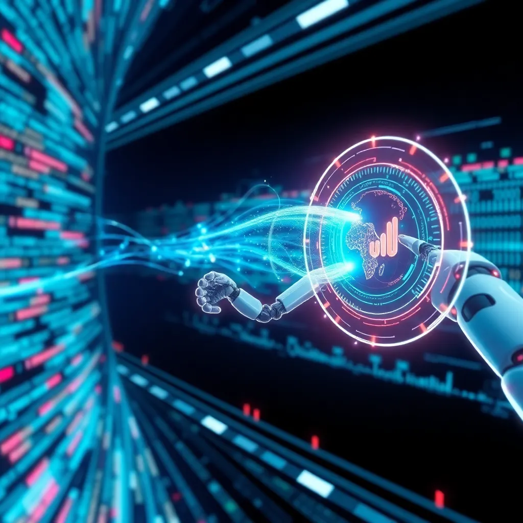 Create a futuristic AI-powered promo video for a cutting-edge technology company. Visualize a sleek, high-tech interface with swirling code and data streams. Incorporate a robotic arm or AI assistant character to highlight the company's innovative solutions. Use vibrant colors and dynamic animations to convey efficiency, precision, and innovation.