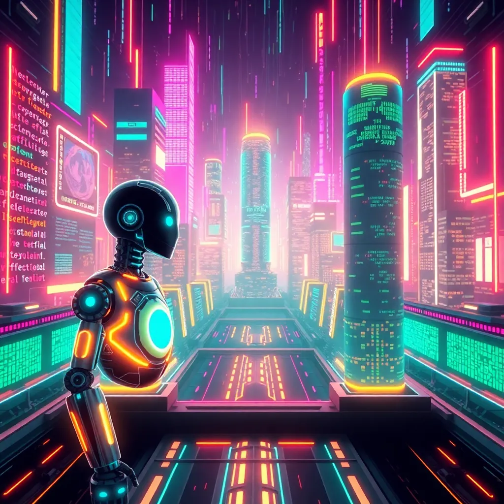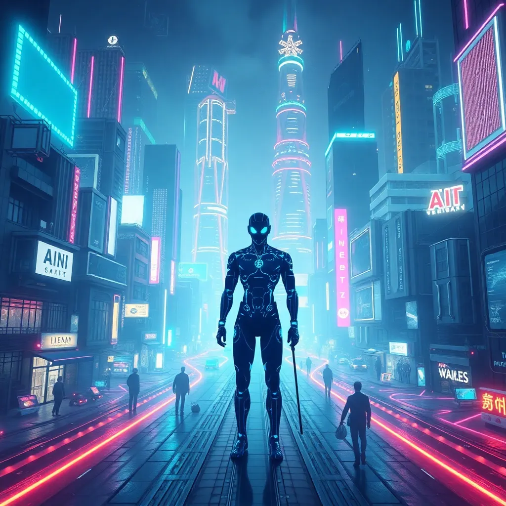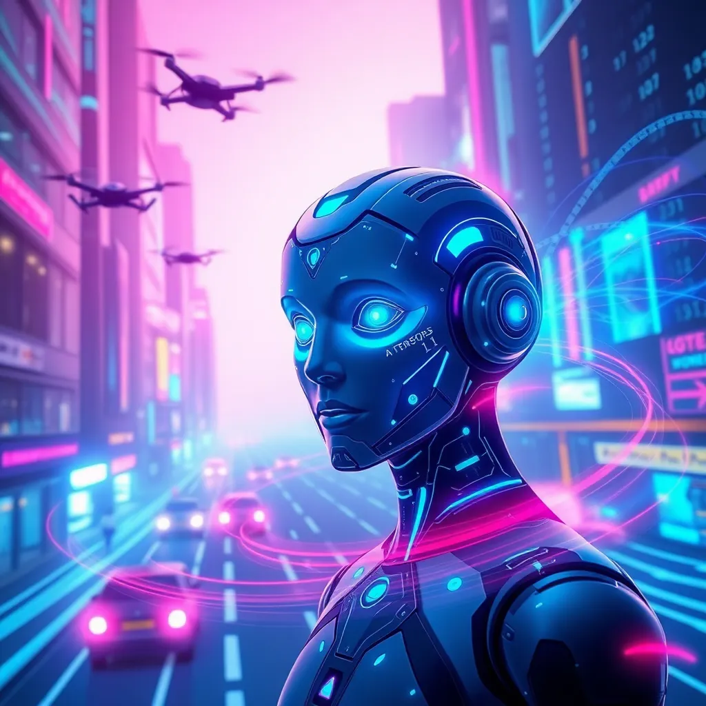 Create an eye-catching AI-powered video promo for a futuristic tech startup. Imagine a sleek, neon-lit cityscape with robots and drones flying by. In the center, a futuristic AI assistant with glowing blue eyes is surrounded by swirling data streams and binary code. Incorporate vibrant colors and dynamic motion graphics.