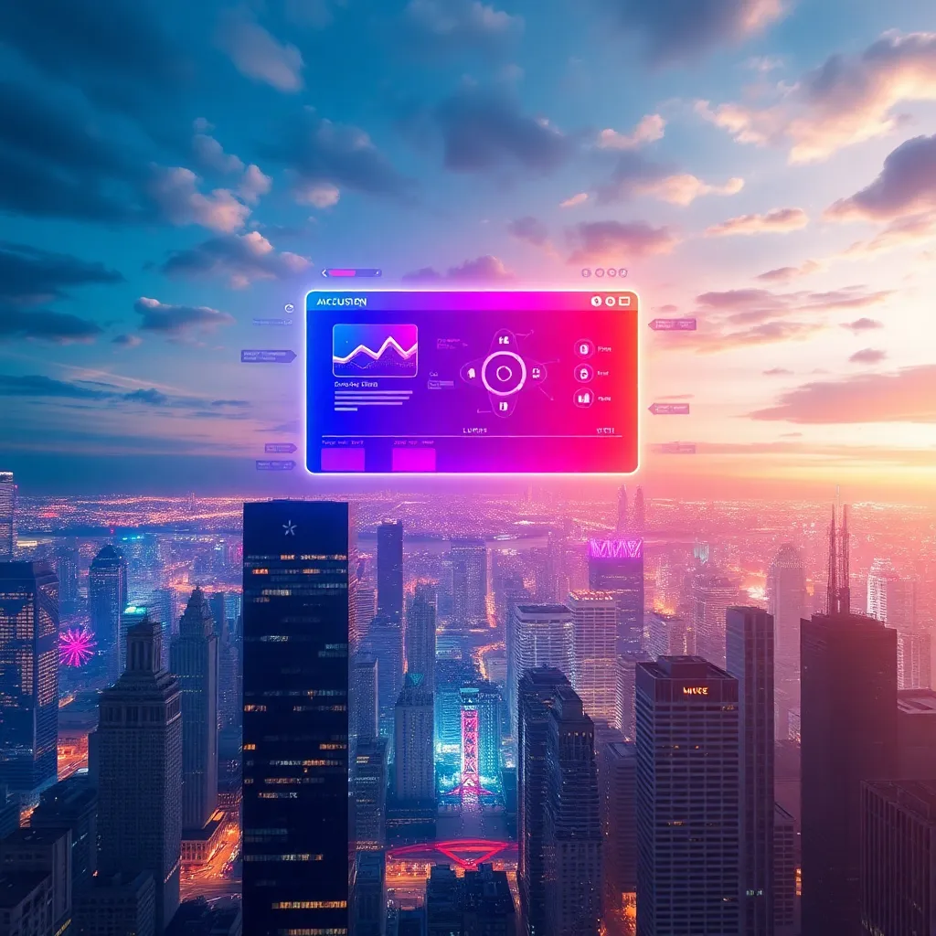 Create a visually stunning image for a revolutionary AI-powered video editing software. Depict a futuristic cityscape with a sleek, glowing interface floating above the skyscrapers. Incorporate vibrant colors, bold typography, and dynamic shapes to convey innovation, creativity, and speed. The image should evoke a sense of excitement and wonder.