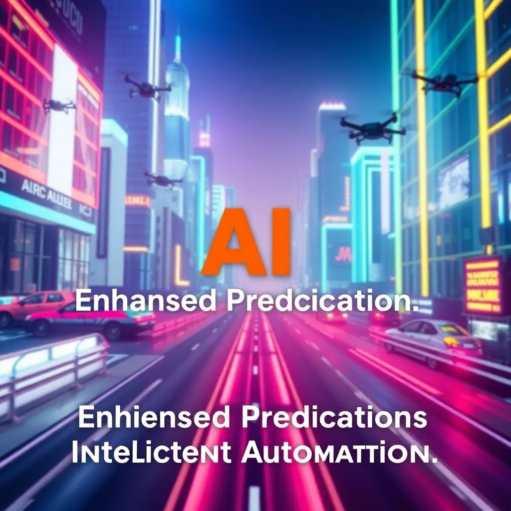 Create a futuristic AI-powered video promo showcasing a sleek, neon-lit cityscape with robots and drones flying by. Incorporate dynamic text overlays highlighting AI's capabilities, such as 'Enhanced Predictions' and 'Intelligent Automation'. Use vibrant colors and smooth animations to convey innovation and progress.