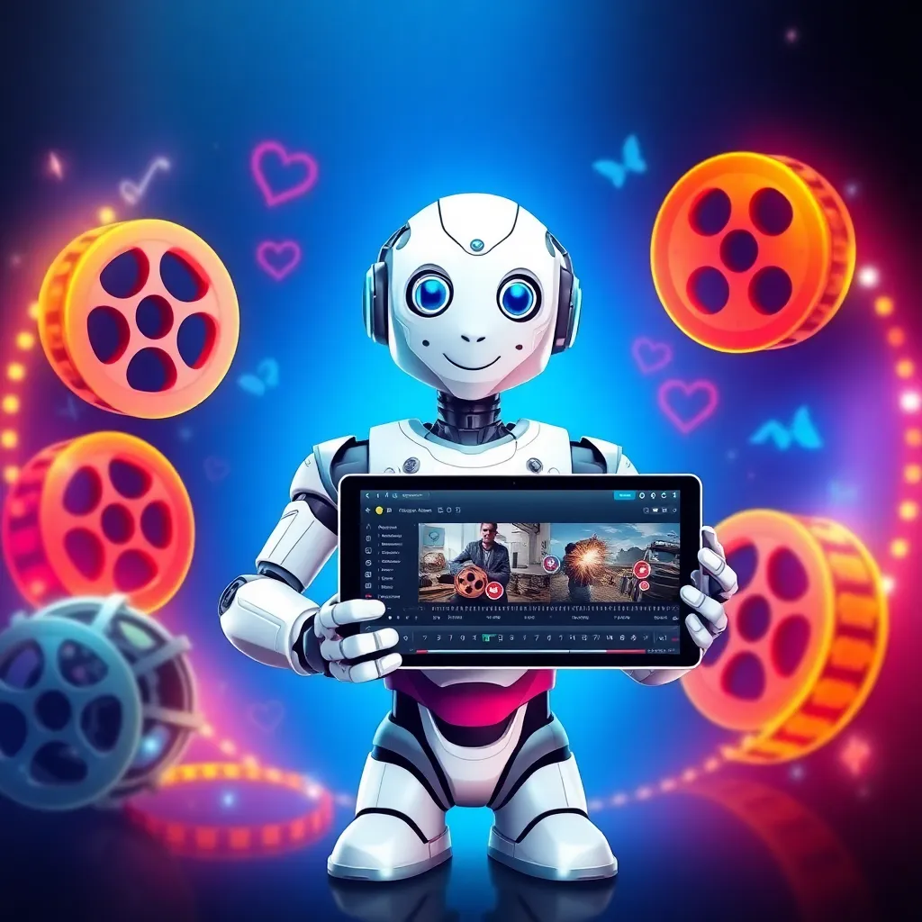 Create an eye-catching image for a futuristic AI-powered video editing software. The image should feature a sleek, modern interface with a AI assistant robot in the center, surrounded by film reels, editing tools, and vibrant colors. The robot should be smiling and holding a tablet with a video editing timeline.