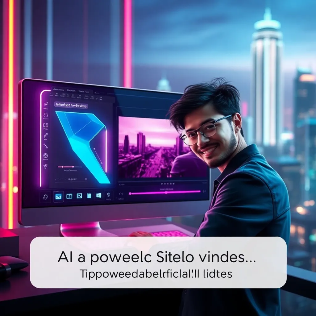 Create a futuristic animation showcasing a sleek AI-powered video maker software. Depict a user effortlessly crafting a promotional video with vibrant visuals and engaging text overlays. Incorporate AI-generated graphics, such as animated logos, 3D models, and kinetic typography, to highlight the software's advanced features and user-friendly interface.