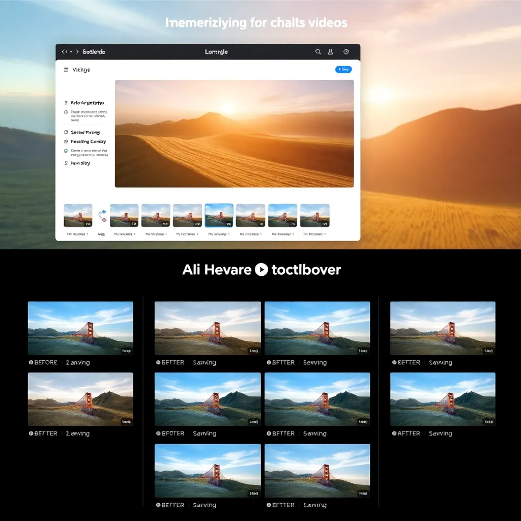 Create a futuristic AI-powered video maker that seamlessly transforms raw footage into mesmerizing promotional videos. Show a sleek, user-friendly interface, AI-generated thumbnails, and a montage of before-and-after video transformations. Highlight the benefits of using the tool, such as time-saving, high-quality results, and ease of use.