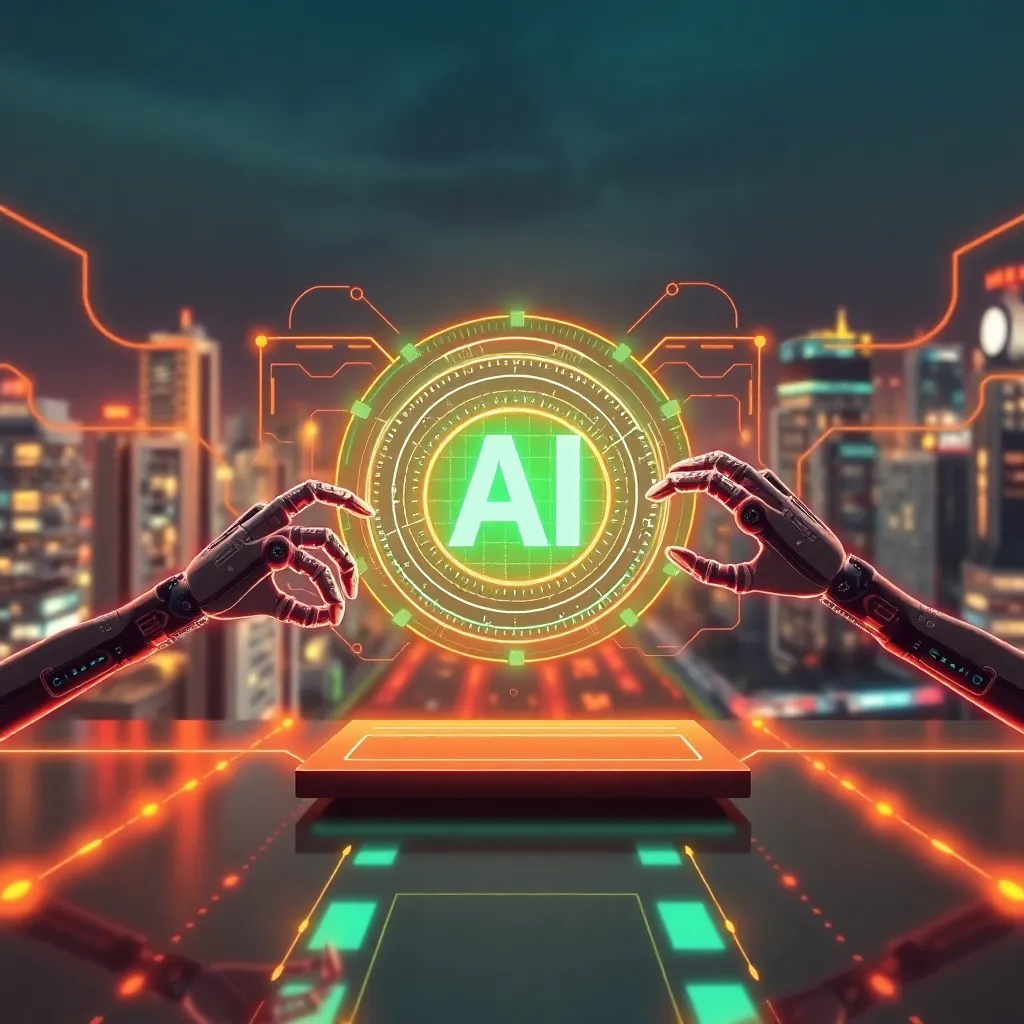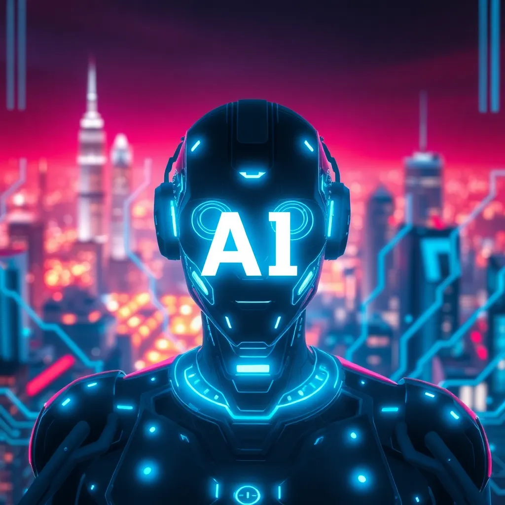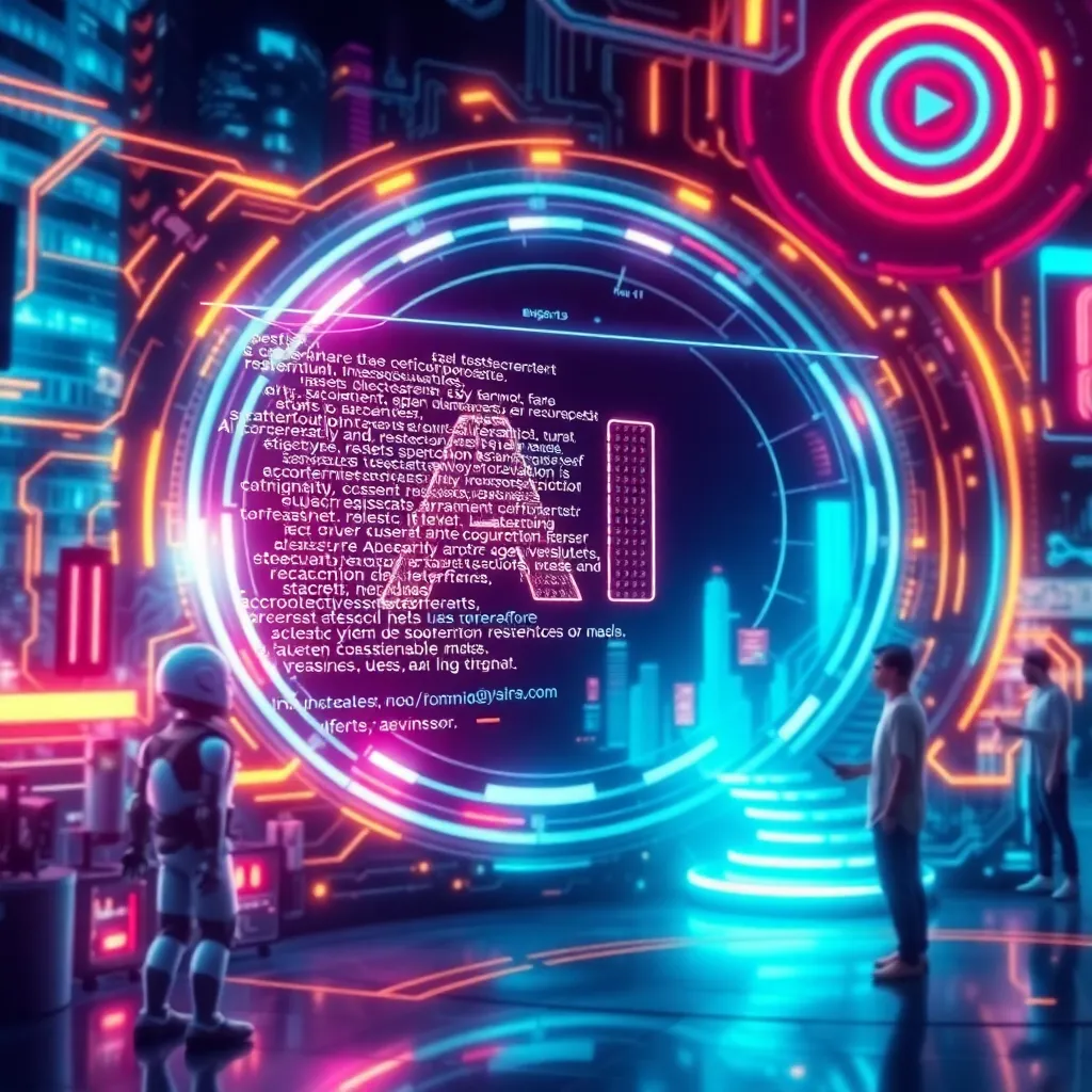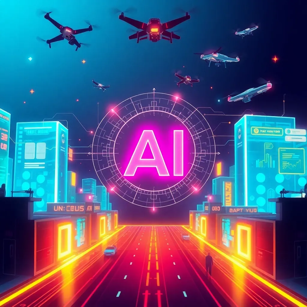 Create a futuristic illustration for a cutting-edge AI video promo. Depict a sleek, neon-lit cityscape with robots and drones flying overhead. In the center, a giant AI logo shines bright, surrounded by swirling data streams and holographic interfaces. Incorporate vibrant colors and dynamic motion lines to convey innovation and excitement.