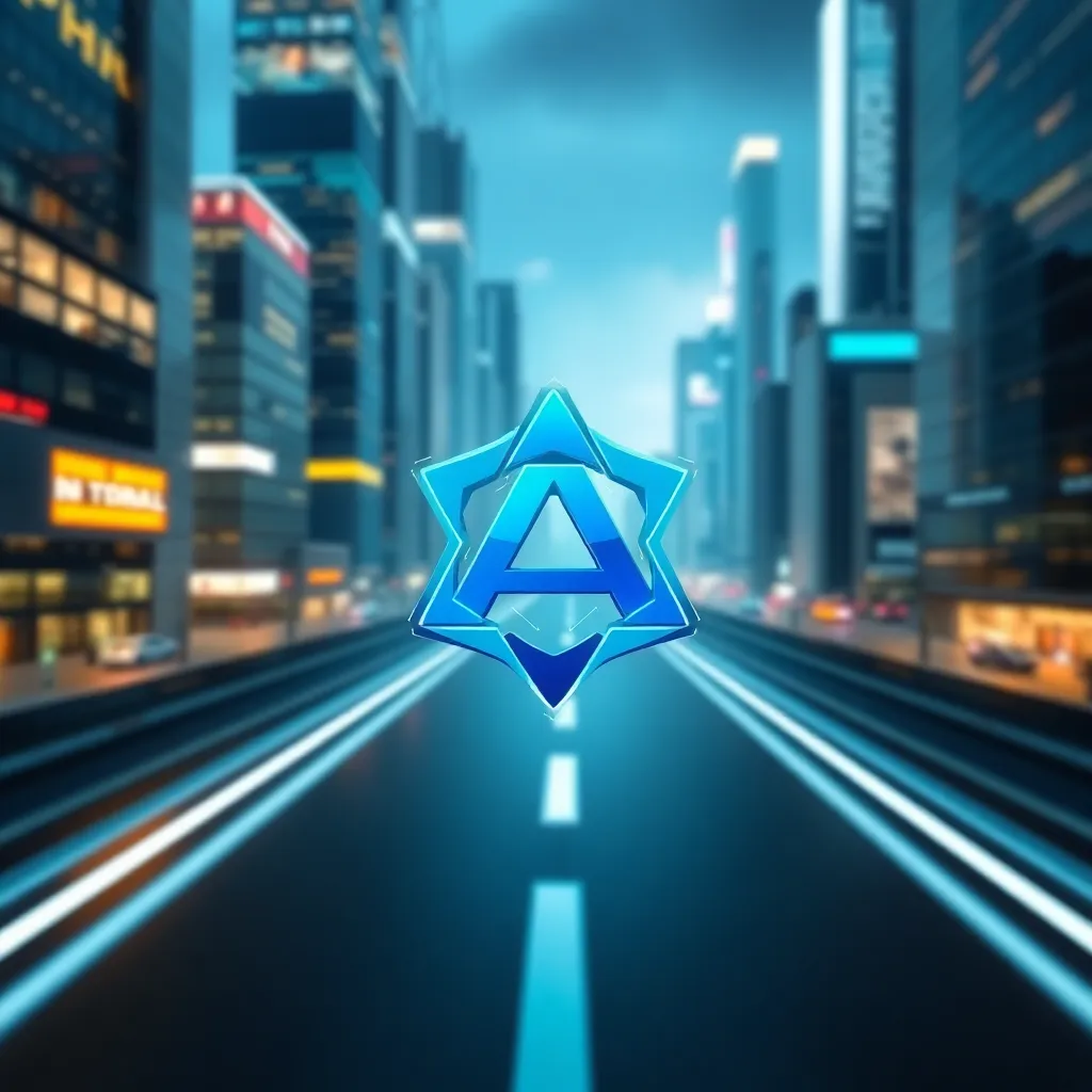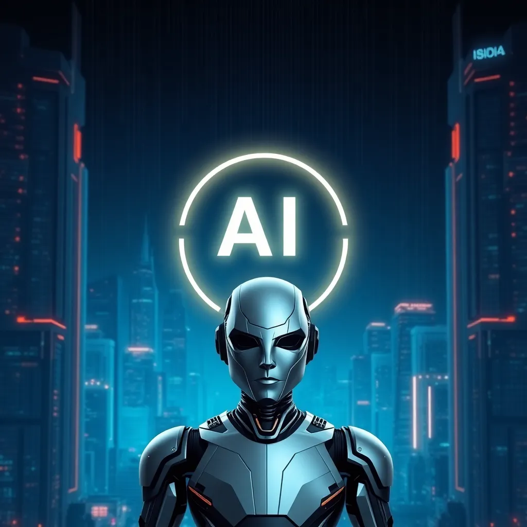 Create a futuristic and sleek image for a cutting-edge AI-powered video promo. Depict a futuristic cityscape with towering skyscrapers and neon lights. In the center, a glowing AI logo floats above a sleek, silver robot. The background is a deep blue with subtle circuit board patterns. Incorporate a subtle glow effect.