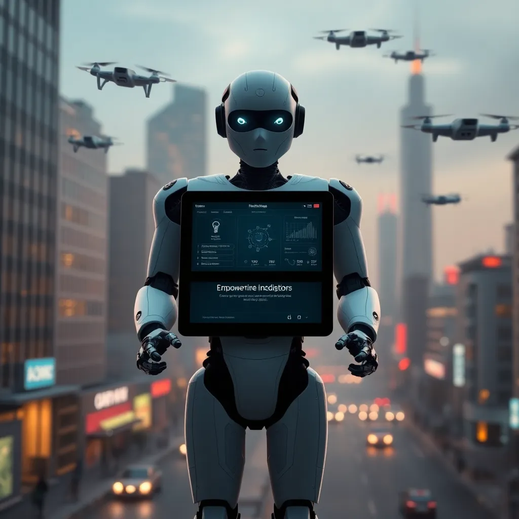 Create an eye-catching promotional video for a cutting-edge AI technology. The video should showcase a futuristic cityscape with robots and drones flying by, with a subtle glow effect. In the center, a humanoid robot stands out, with a screen displaying a user-friendly interface and a tagline 'Empowering Intelligent Decisions'.