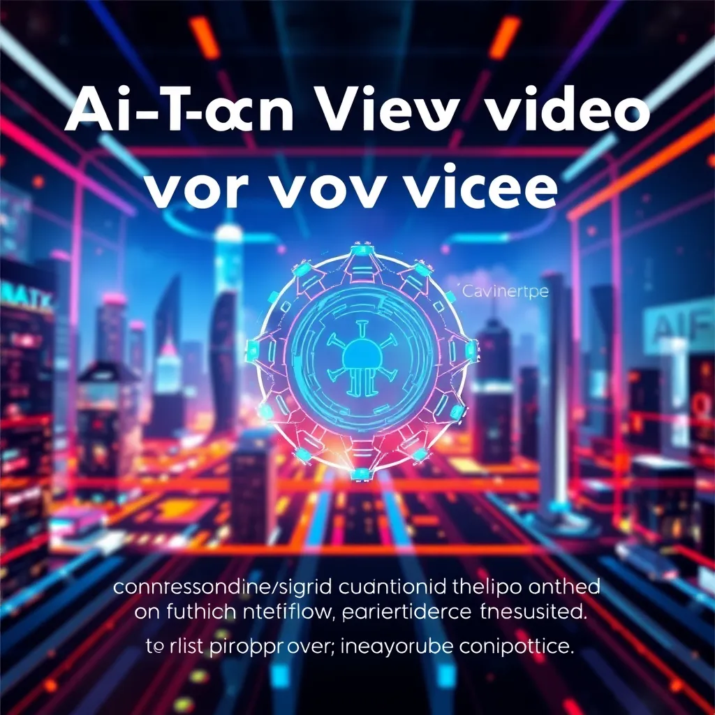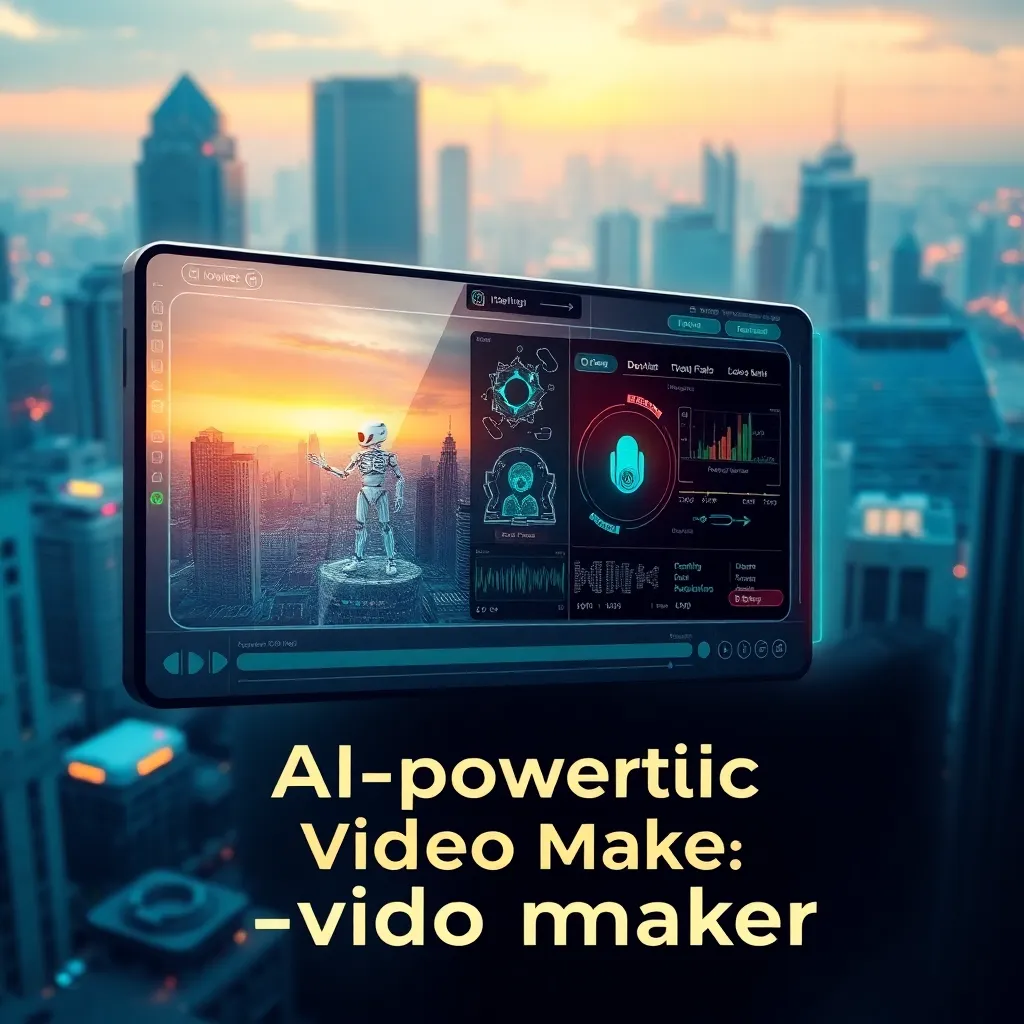 Create an eye-catching image for a futuristic AI-powered video maker. Depict a sleek, high-tech interface with a cityscape background. Incorporate AI-related elements such as robots, circuits, and code. Use vibrant colors and bold typography to highlight the tool's capabilities. The image should convey innovation, efficiency, and creativity.