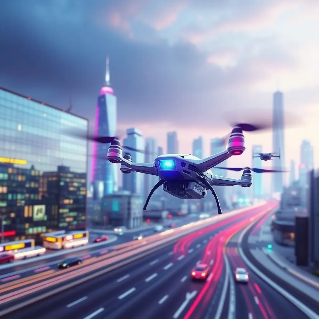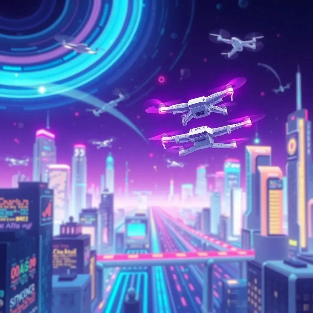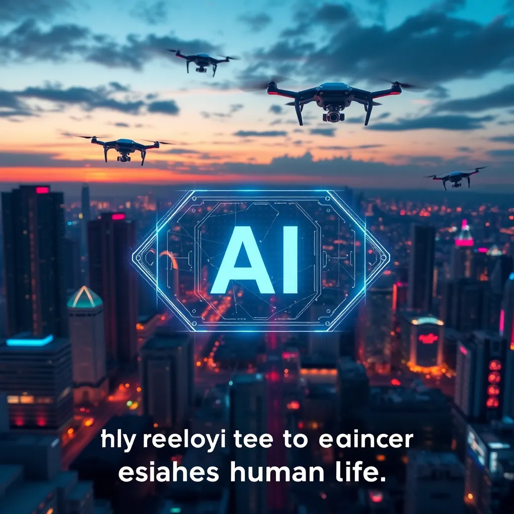 Create a futuristic and innovative AI-powered promo video for a cutting-edge tech company. Visualize a sleek and modern cityscape with AI-generated robots and drones in motion, highlighting the company's pioneering work in artificial intelligence and its potential to transform industries and lives. Use vibrant colors and dynamic graphics.