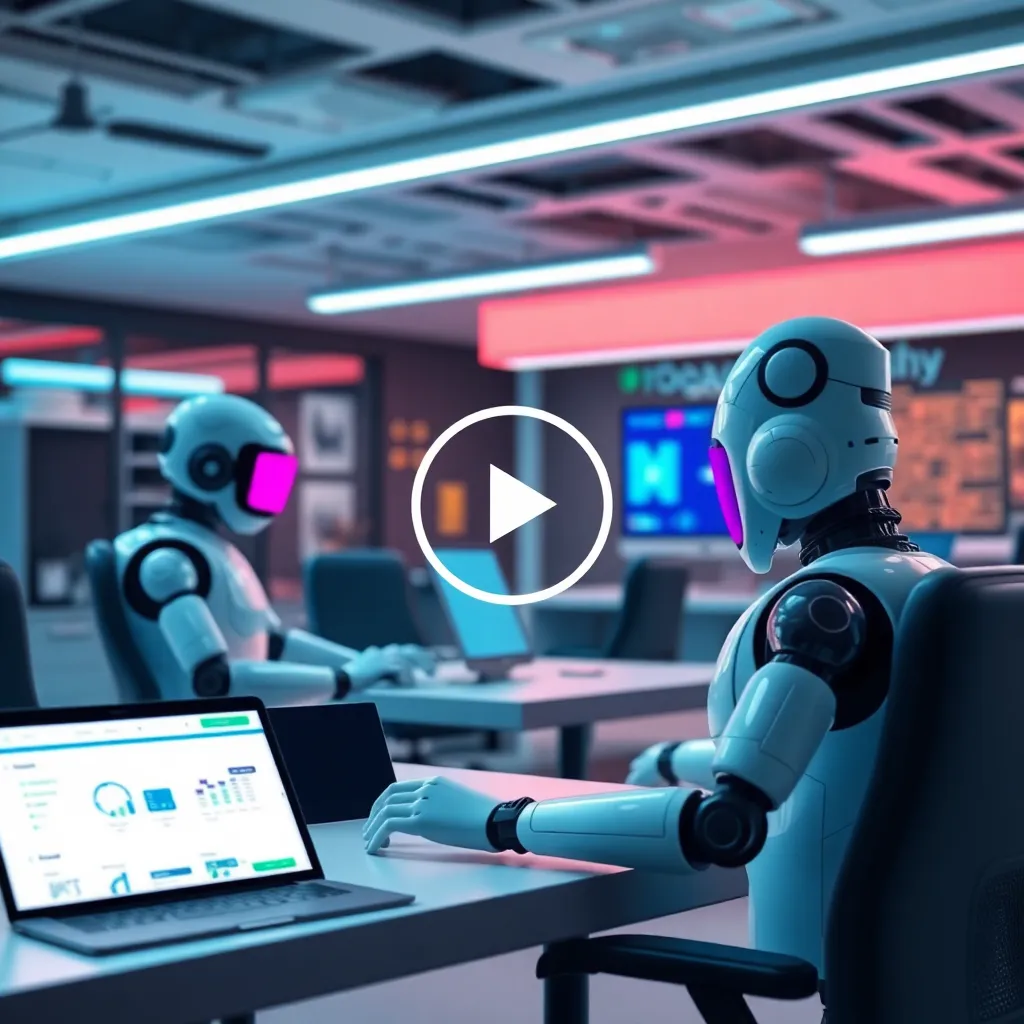 Create a futuristic and sleek promotional video for an AI-powered tool that helps businesses optimize their workflow and increase productivity. The video should showcase a futuristic office setting with robots and AI assistants working together seamlessly, with vibrant colors and dynamic animations to highlight the tool's benefits.