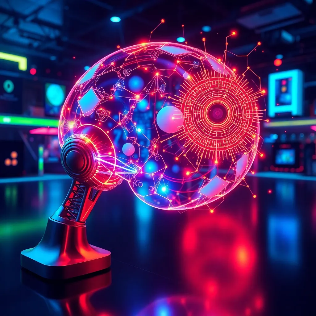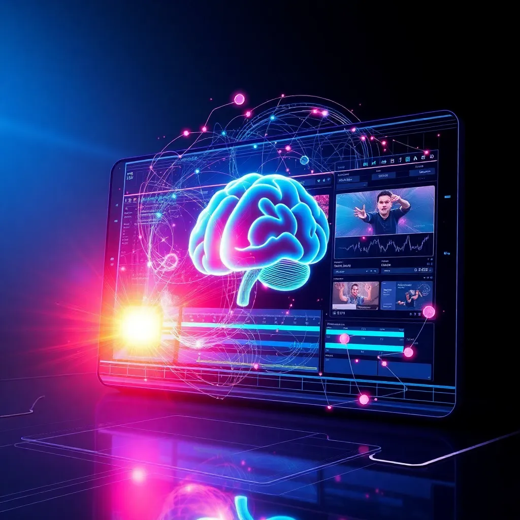 Create a futuristic concept art for a cutting-edge AI-powered video editing software. Depict a sleek, high-tech interface with a glowing AI brain at its center, surrounded by swirling digital particles and editing tools. Incorporate bold colors and dynamic shapes to convey innovation and creativity.