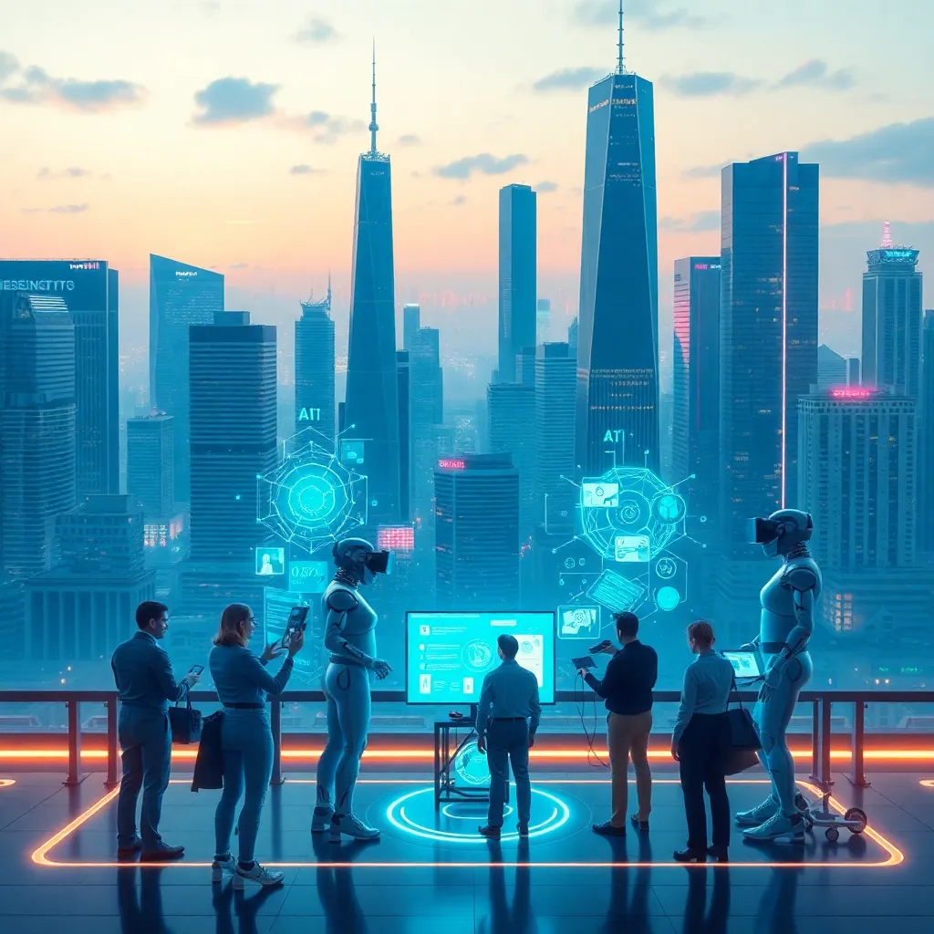 Create a futuristic and innovative AI promo video featuring a cityscape with sleek skyscrapers and neon lights. Show a group of people working together with AI-powered robots, surrounded by holographic screens and virtual reality equipment. Highlight the benefits of AI in transforming industries and improving lives.