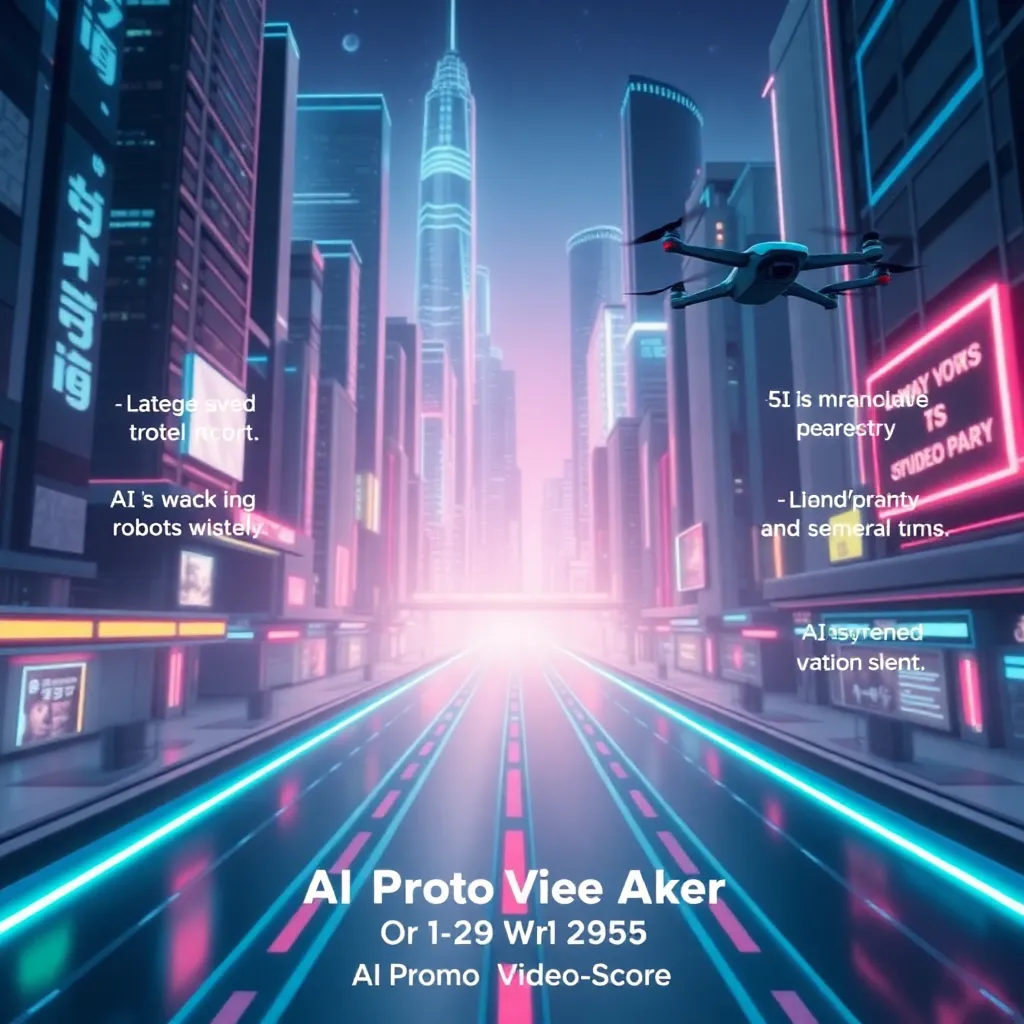 Create a futuristic AI Promo Video Maker that generates stunning visuals showcasing its capabilities. Design a sleek, neon-lit cityscape with AI-powered robots, holographic displays, and swirling code patterns. Incorporate dynamic lighting, animations, and a pulsing soundtrack to convey innovation and excitement