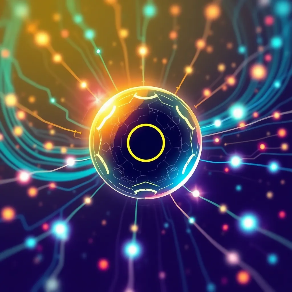 Create a futuristic illustration for a cutting-edge AI-powered video marketing tool. Depict a sleek, glowing orb surrounded by swirling data streams and glowing circuitry. Incorporate vibrant colors and bold lines to convey innovation and creativity. The AI orb should be the central focus, with a subtle hint of motion and energy.