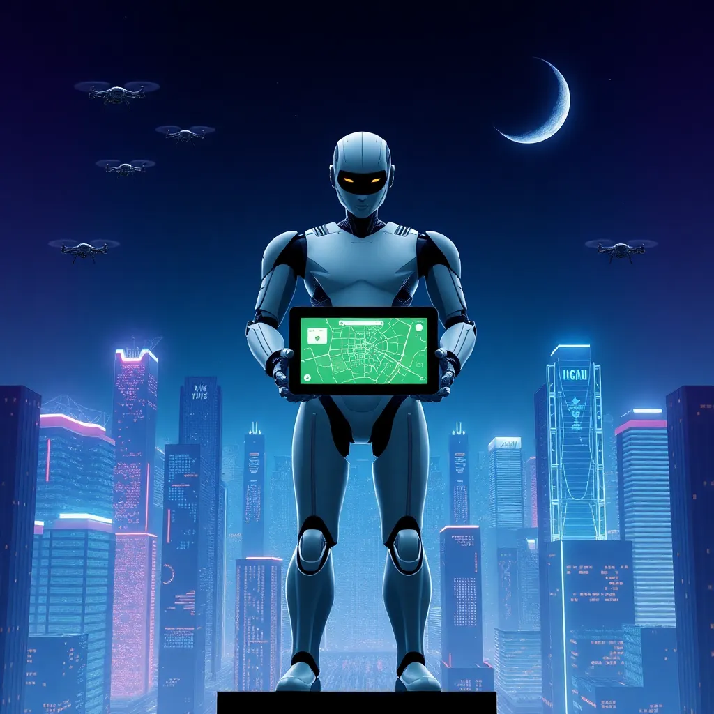 Create a futuristic cityscape with a sleek AI-powered robot standing tall in the center, surrounded by neon-lit skyscrapers and flying drones. The robot's arms are extended, holding a tablet displaying a city map. The background is a dark blue sky with stars and a crescent moon. Incorporate a sense of innovation and progress.