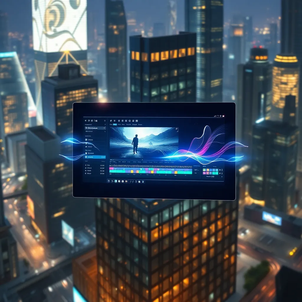 Create an eye-catching promotional image for a revolutionary AI-powered video editing software. The image should feature a futuristic cityscape with a sleek, high-tech video editing interface superimposed on a building, surrounded by flashing lights and holographic screens, conveying innovation, creativity, and cutting-edge technology.