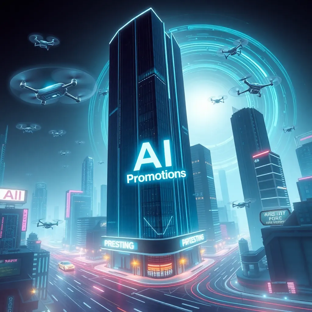 Create a futuristic cityscape with a sleek, high-tech skyscraper in the center, surrounded by flying drones, hovercars, and neon-lit streets. The building should have a large, glowing logo reading 'AI Promotions' in bold, futuristic font. Incorporate swirling digital patterns and a subtle, pulsing light effect.