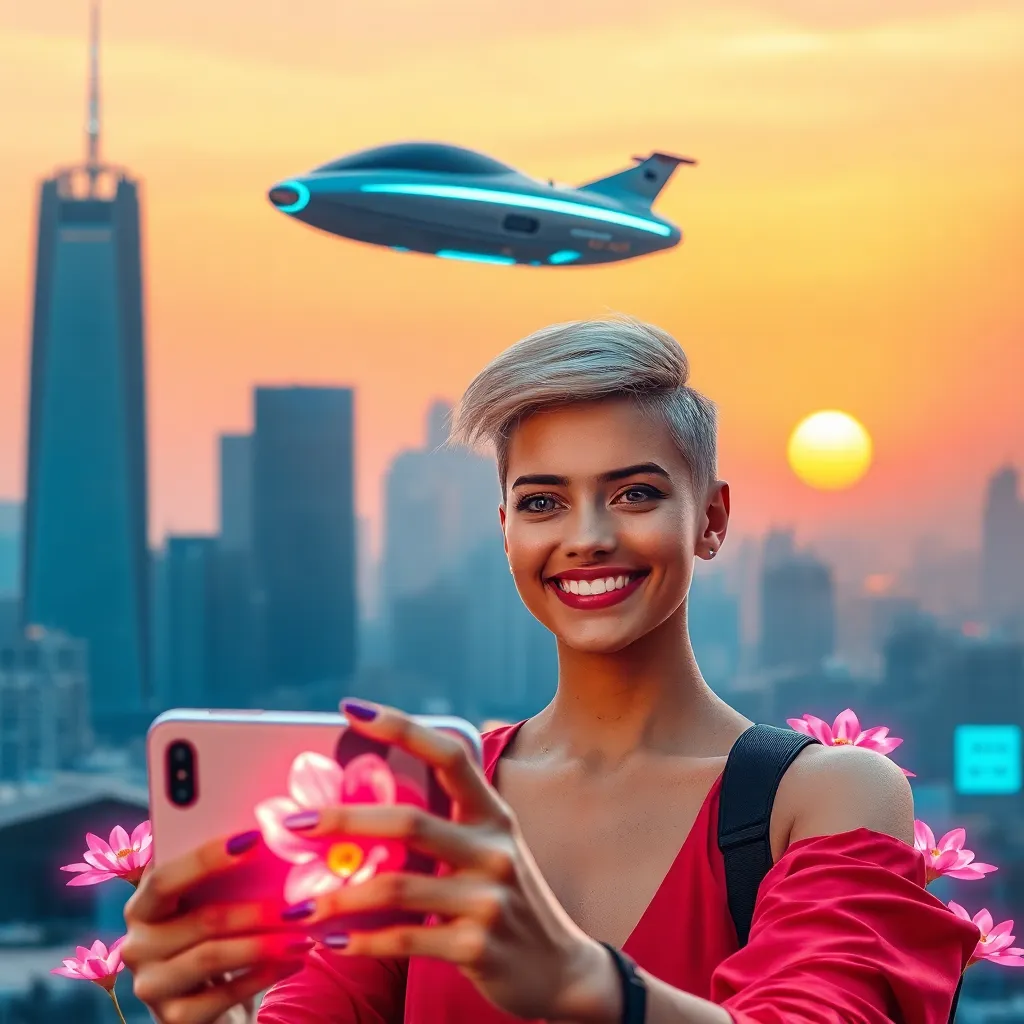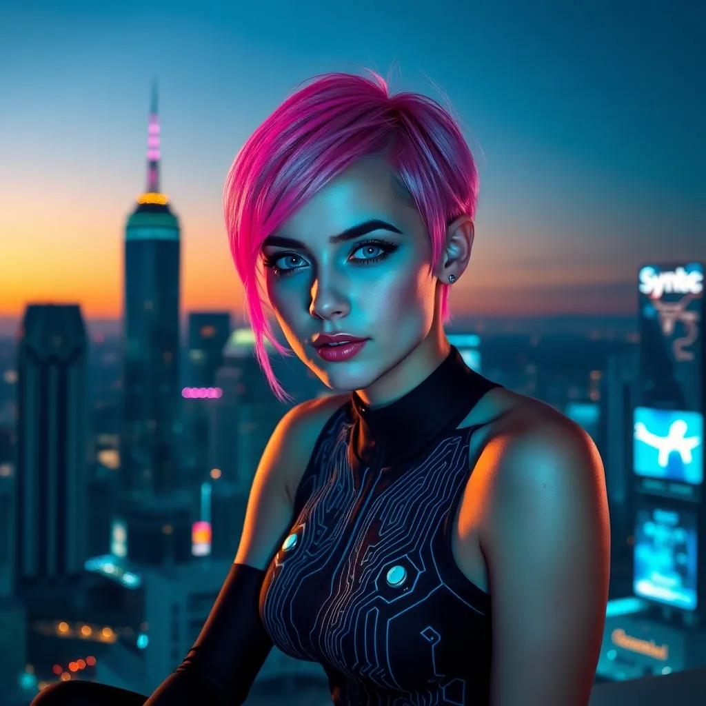 Create a futuristic selfie of a young woman with short, neon-pink hair and piercing blue eyes. She's wearing a sleek black jumpsuit with metallic accents and standing in front of a cityscape at sunset, with a holographic display projected above her head. Incorporate subtle AI-generated details and effects.