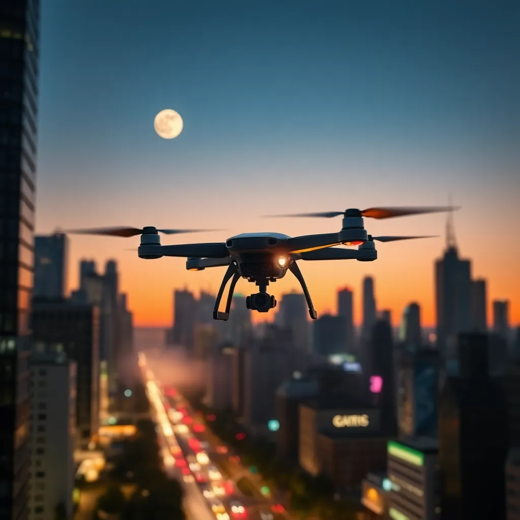 Create a futuristic cityscape at sunset with a sleek, hovering drone in the foreground, surrounded by towering skyscrapers and a vibrant city street below. Incorporate neon lights, a full moon, and a subtle city fog effect. The drone should be equipped with a bright, glowing propeller and a sleek, metallic body.