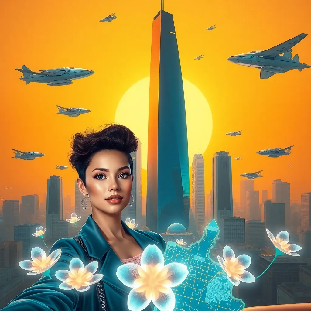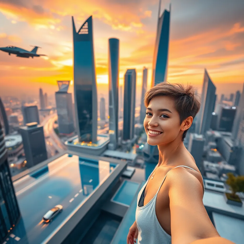 Imagine a futuristic cityscape at sunset, with towering skyscrapers and flying cars zipping by. A lone figure, dressed in a sleek black jumpsuit, stands atop a glowing skyscraper, looking out at the breathtaking view. Generate an AI selfie of this character, capturing their confident and adventurous spirit.