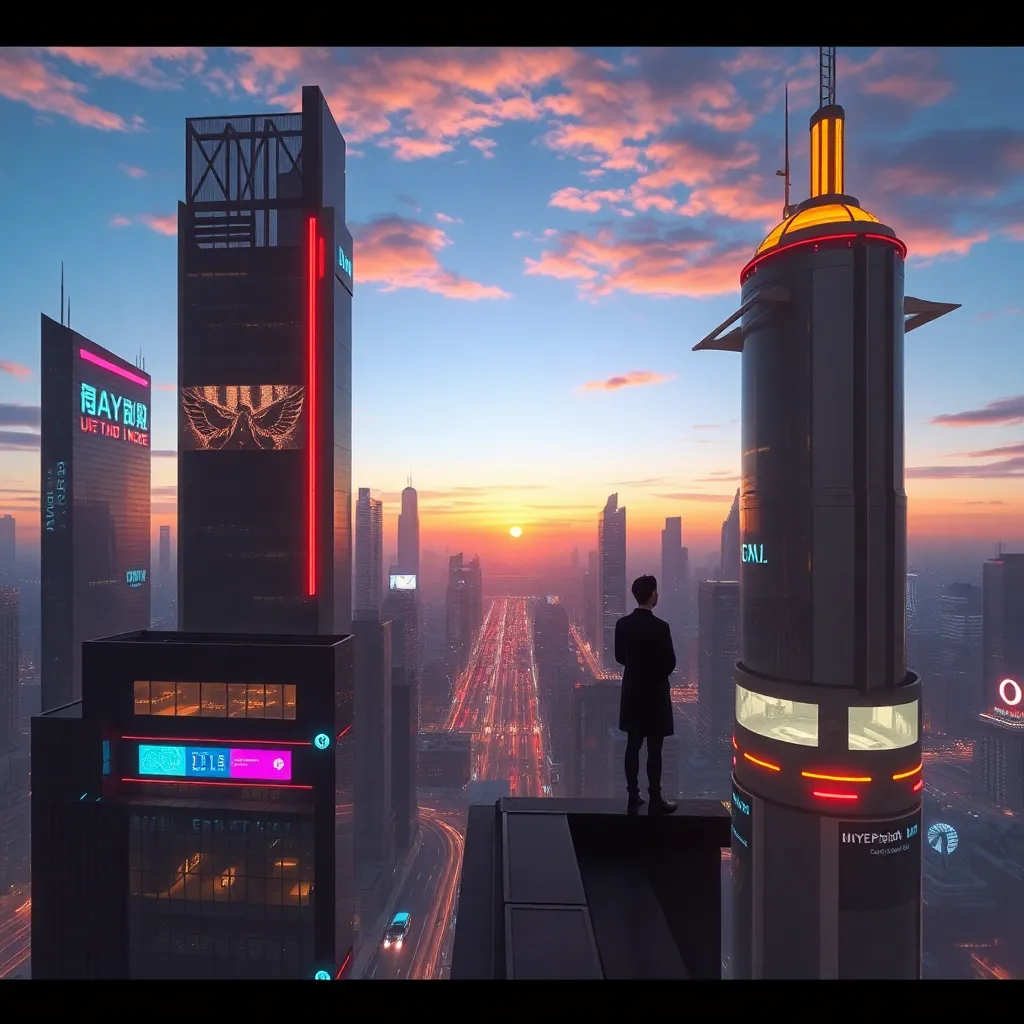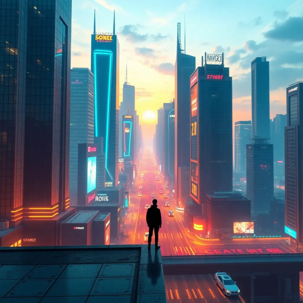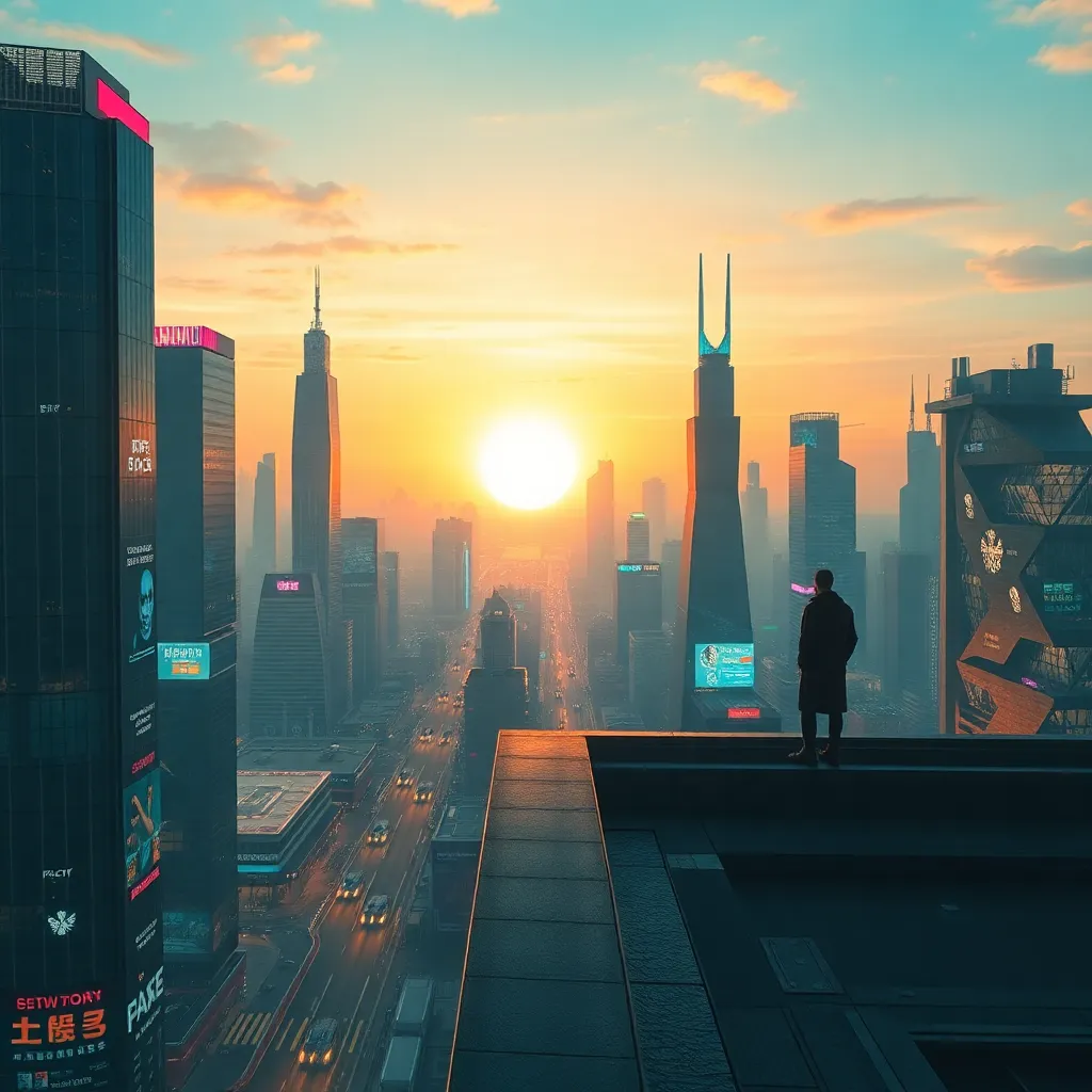 Create a futuristic cityscape at sunset, with sleek skyscrapers and flying cars zipping by. A lone figure stands at the edge of the rooftop, gazing out at the breathtaking view. Incorporate neon lights, holographic advertisements, and a subtle sense of mystery. Use a combination of warm and cool colors to evoke a sense of nostalgia and innovation.