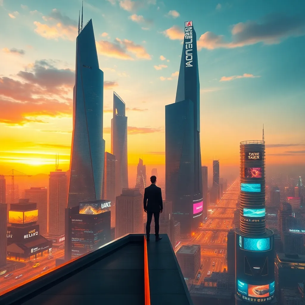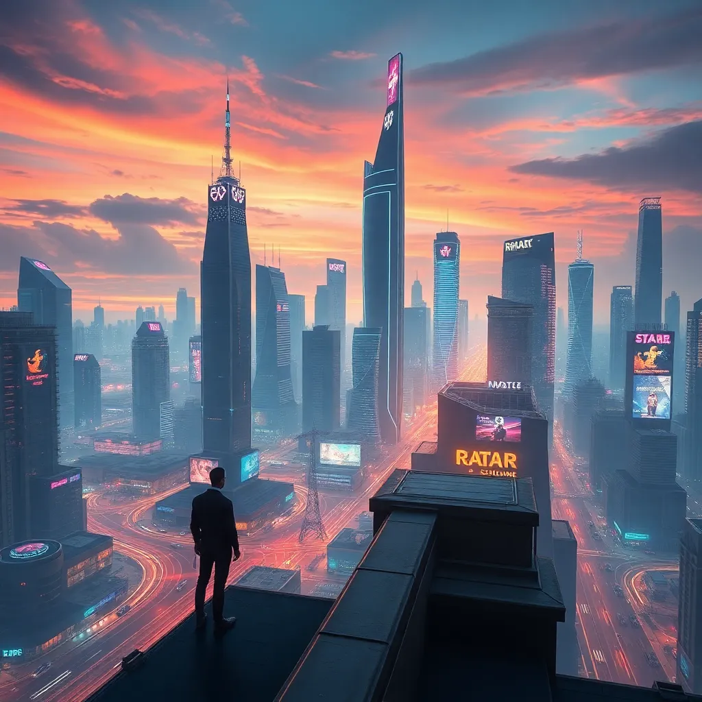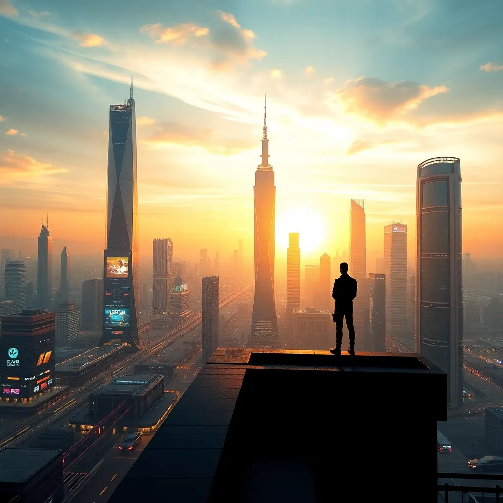 Create a futuristic cityscape at sunset, with sleek skyscrapers and flying cars zipping by. A lone figure stands at the edge of the rooftop, gazing out at the breathtaking view. Incorporate neon lights, holographic advertisements, and a subtle sense of mystery. Use a combination of warm and cool colors to evoke a sense of nostalgia and innovation.