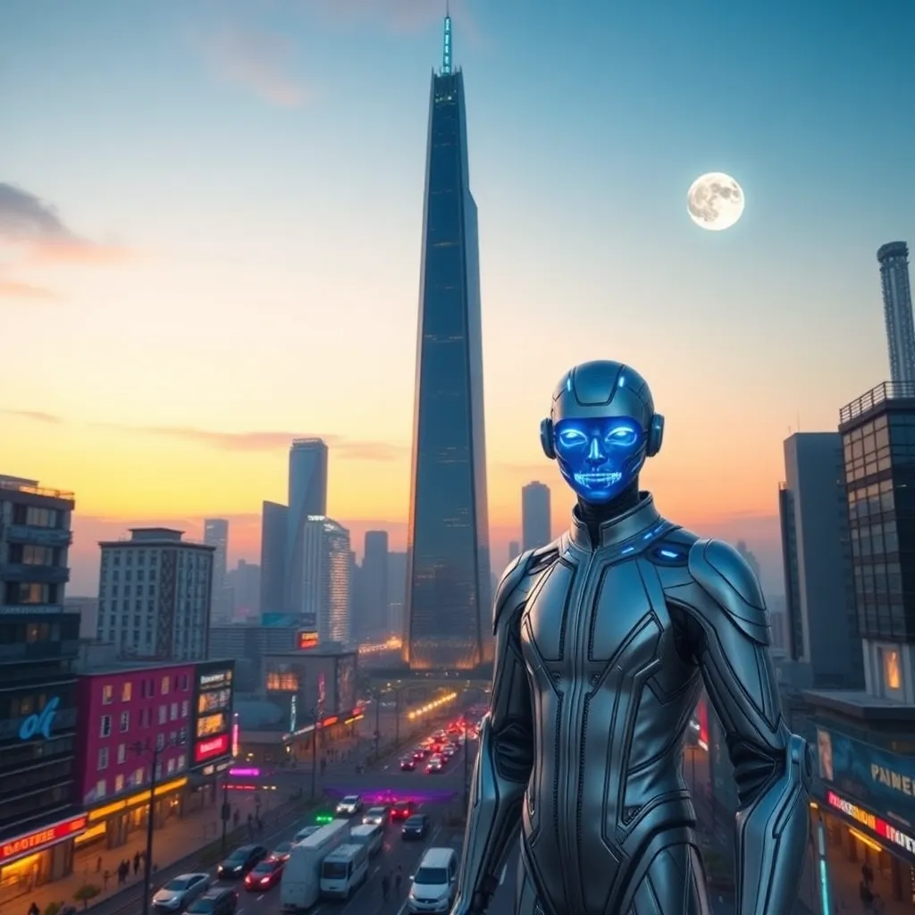 Create a futuristic cityscape at sunset, with a sleek, silver skyscraper standing tall in the center. Incorporate vibrant neon lights, a bustling street below, and a distant, glowing moon. The AI selfie should be a futuristic individual with glowing blue eyes, dressed in a metallic jumpsuit, standing confidently in front of the skyscraper.