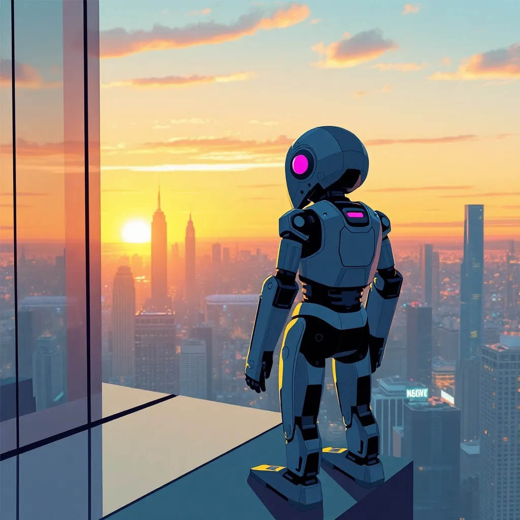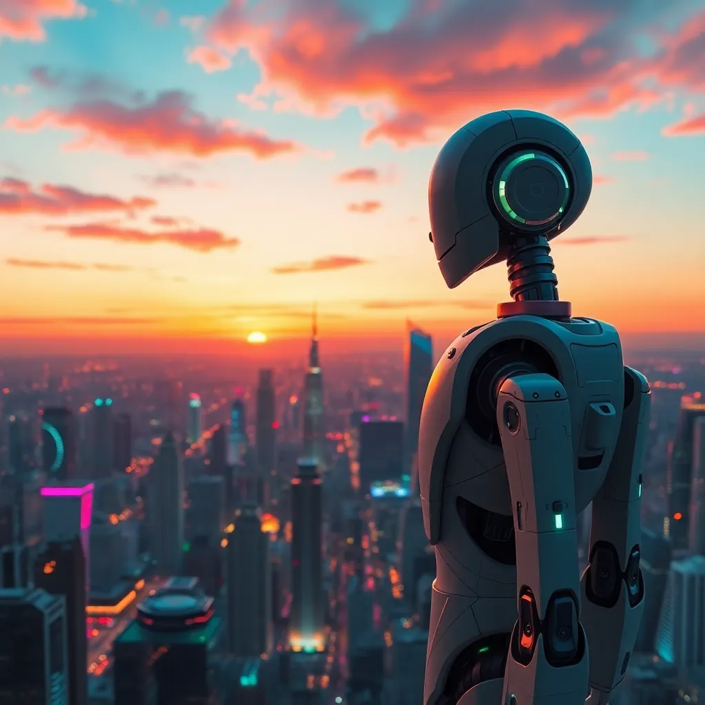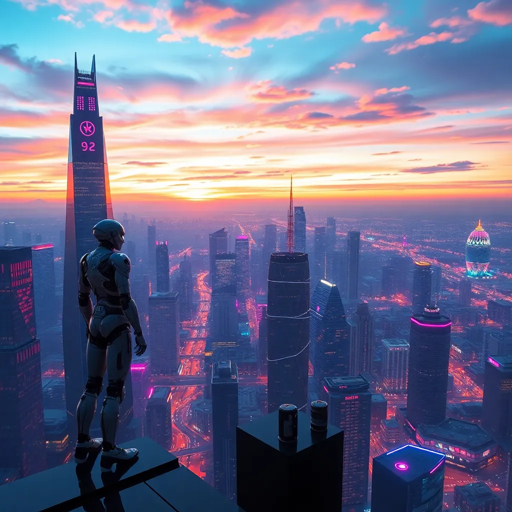 Create a futuristic cityscape at sunset with a robotic figure standing atop a skyscraper, gazing out at a sprawling metropolis. Incorporate neon lights, sleek architecture, and a vibrant orange-pink sky. The robot should be designed with a mix of human-like and mechanical features, with a subtle smile on its face.