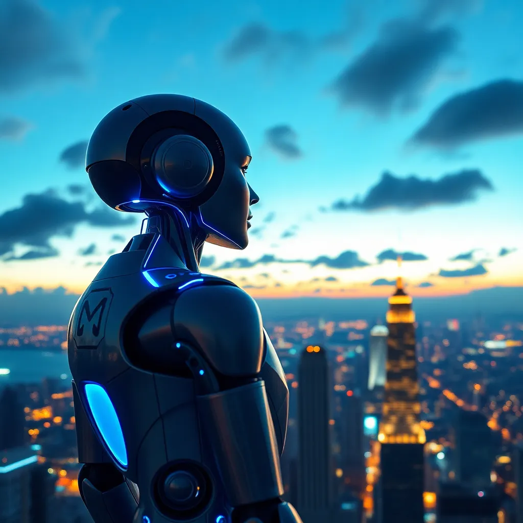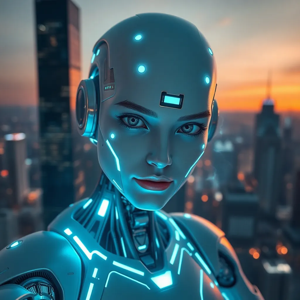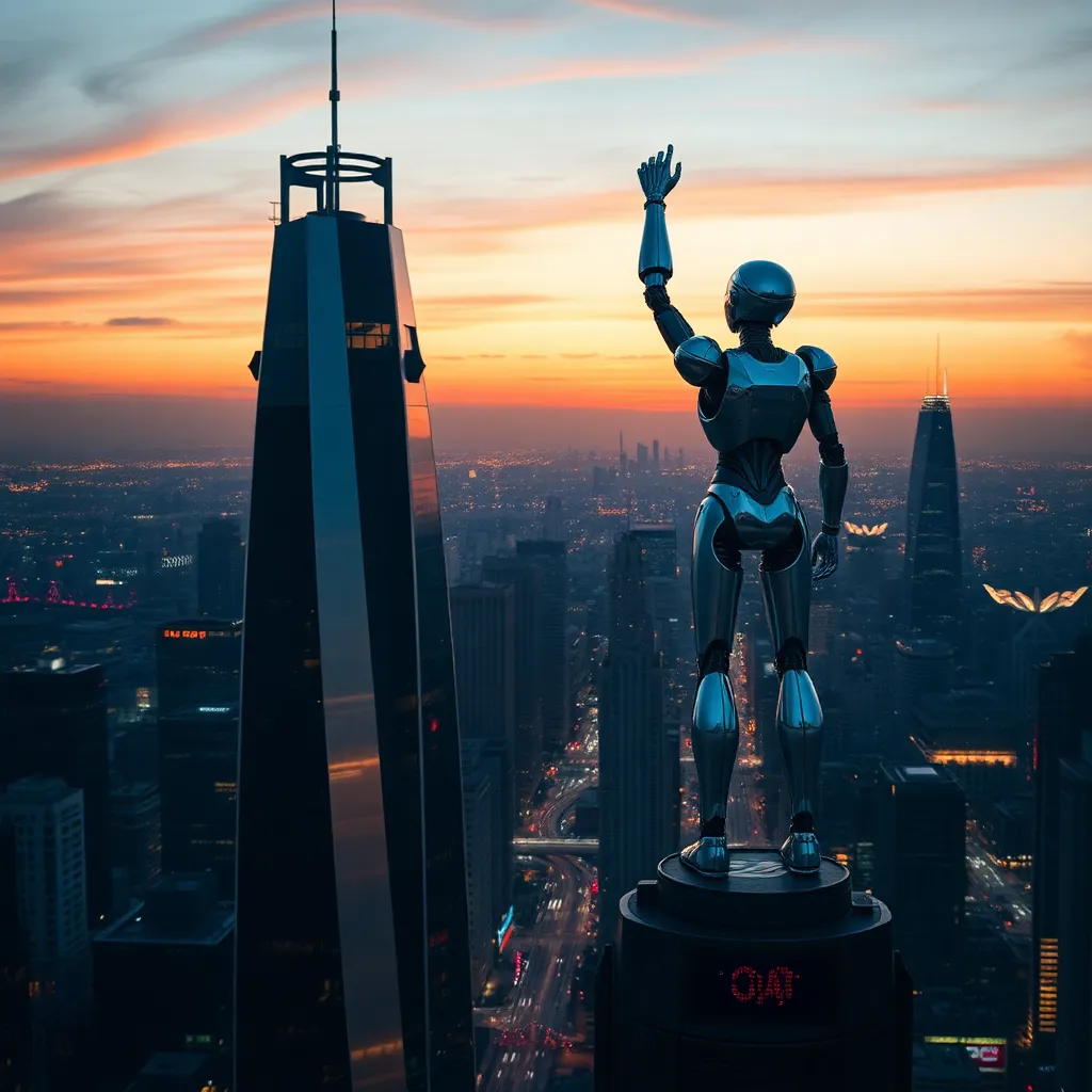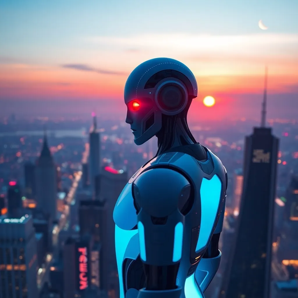 Create a futuristic cityscape at sunset with a robotic figure standing atop a skyscraper, gazing out at a sprawling metropolis. Incorporate neon lights, sleek architecture, and a vibrant orange-pink sky. The robot should be designed with a mix of human-like and mechanical features, with a subtle smile on its face.