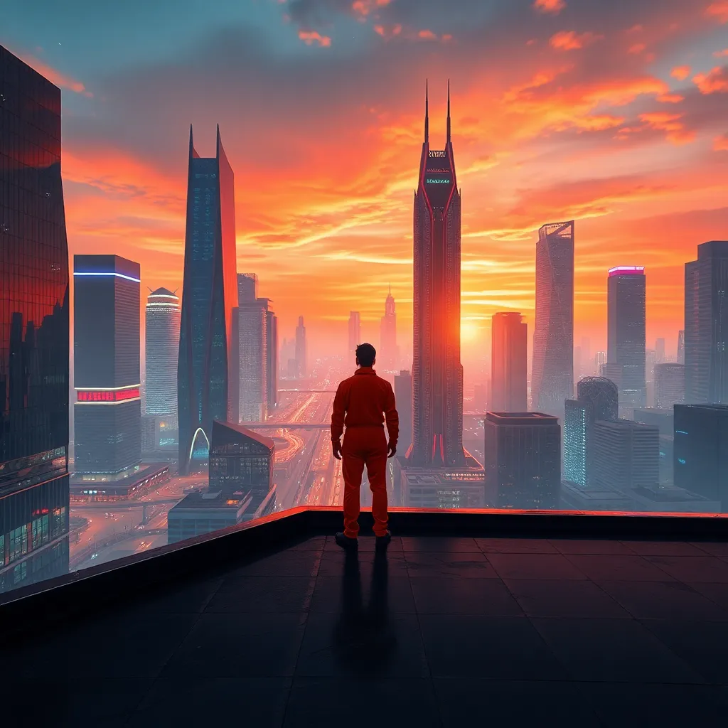 Create a futuristic cityscape at sunset, with sleek skyscrapers and neon lights reflecting off the wet pavement. A lone figure, dressed in a bold orange jumpsuit, stands at the edge of the rooftop, gazing out at the breathtaking view. Incorporate AI-generated textures and patterns to enhance the city's futuristic feel.