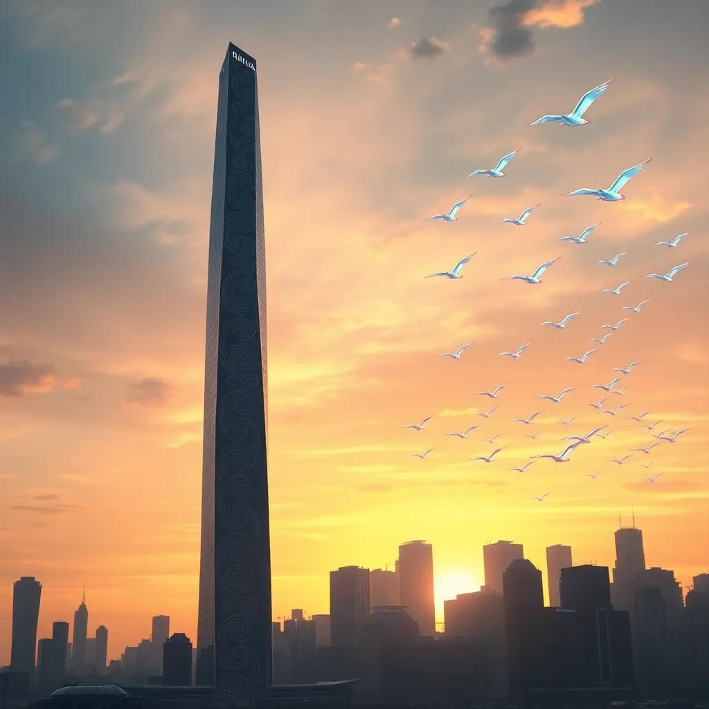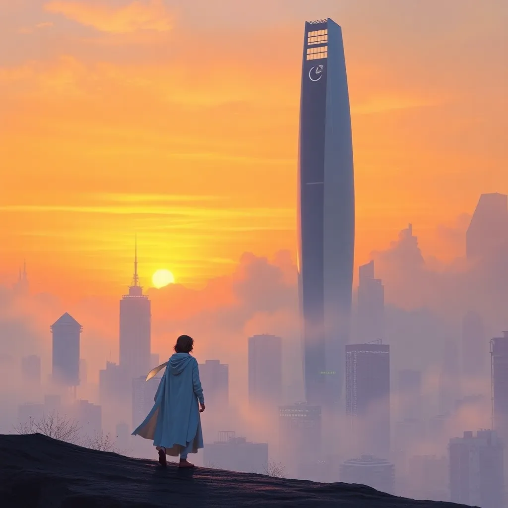 Create a futuristic cityscape at sunset, with a sleek, silver skyscraper rising from the misty horizon. Incorporate a lone figure in the foreground, dressed in a flowing white cloak, gazing up at the towering structure with a mix of wonder and trepidation. Use vibrant oranges, yellows, and purples to capture the atmosphere.