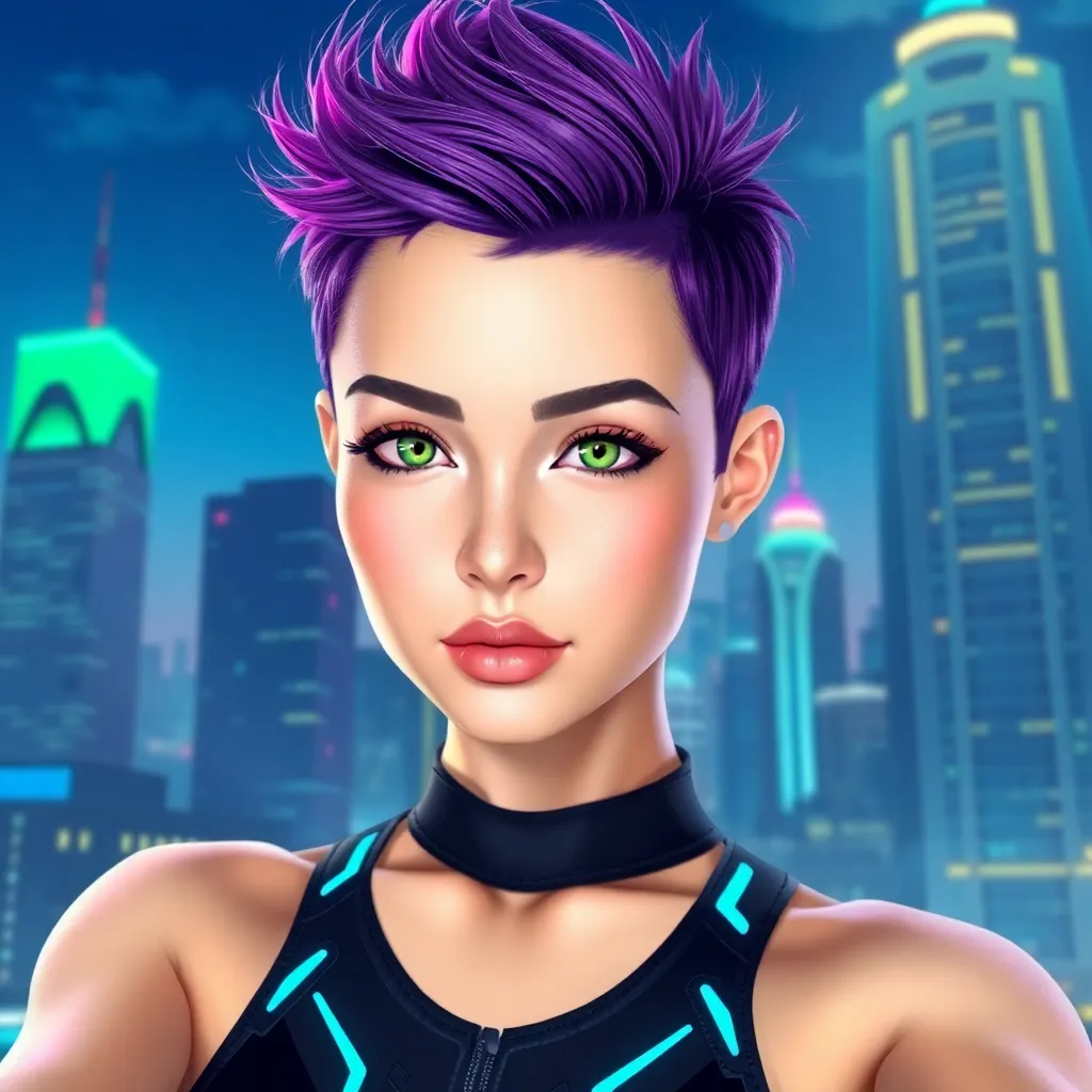 Create a futuristic AI selfie of a young woman with short, spiky purple hair and piercing green eyes. She's wearing a sleek black jumpsuit with neon blue accents and standing in front of a cityscape with towering skyscrapers and a bright, neon-lit sky. Incorporate subtle AI-inspired elements, such as circuitry patterns or holographic effects.