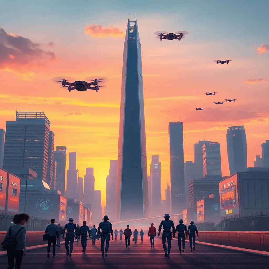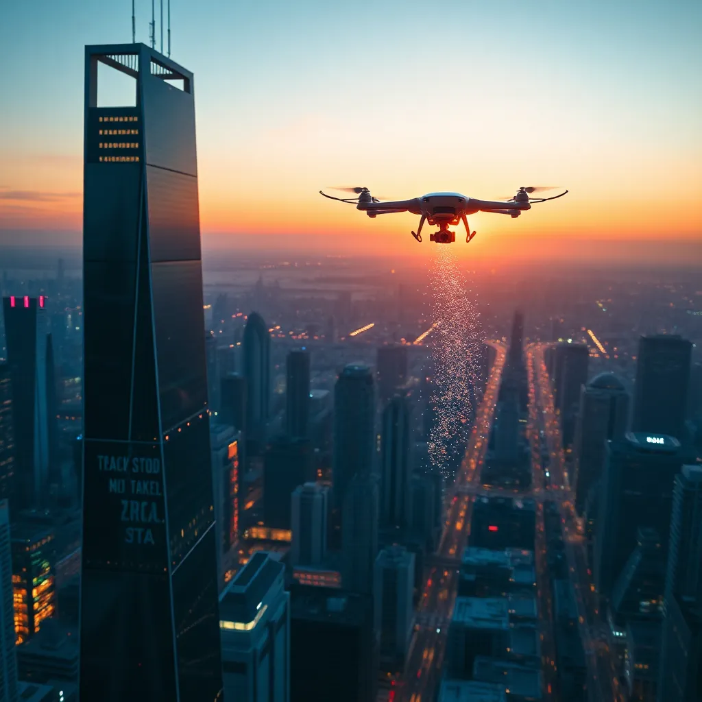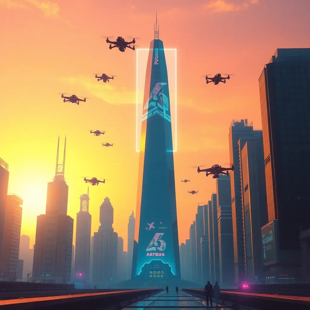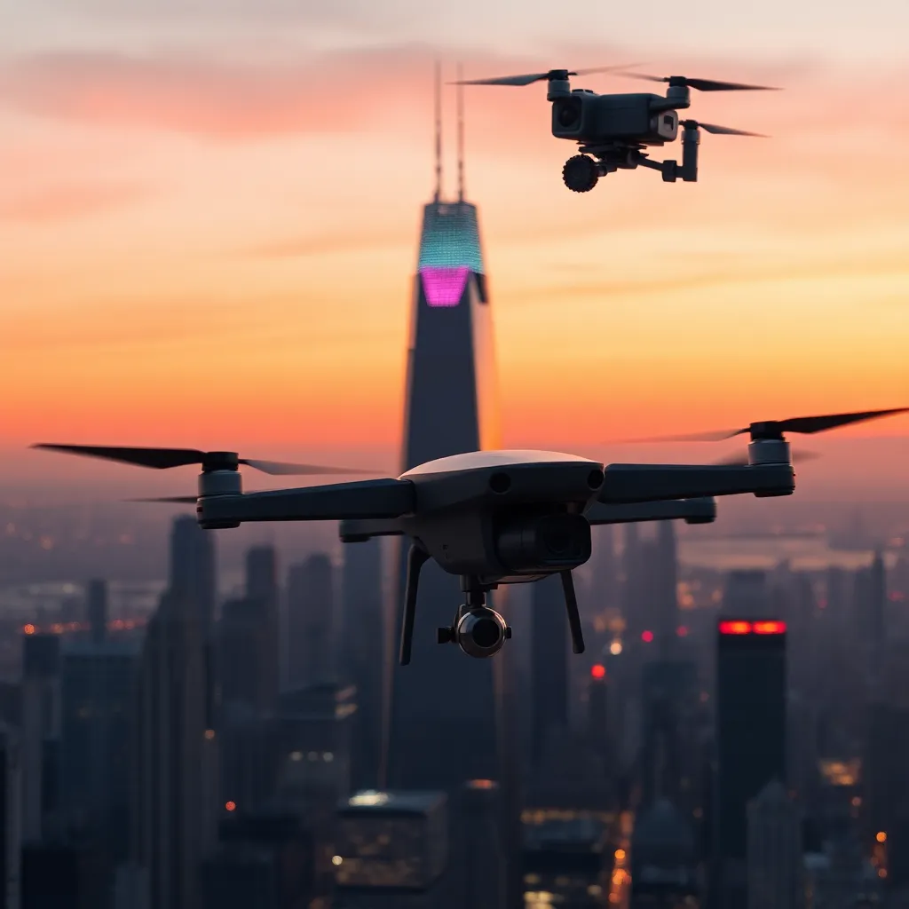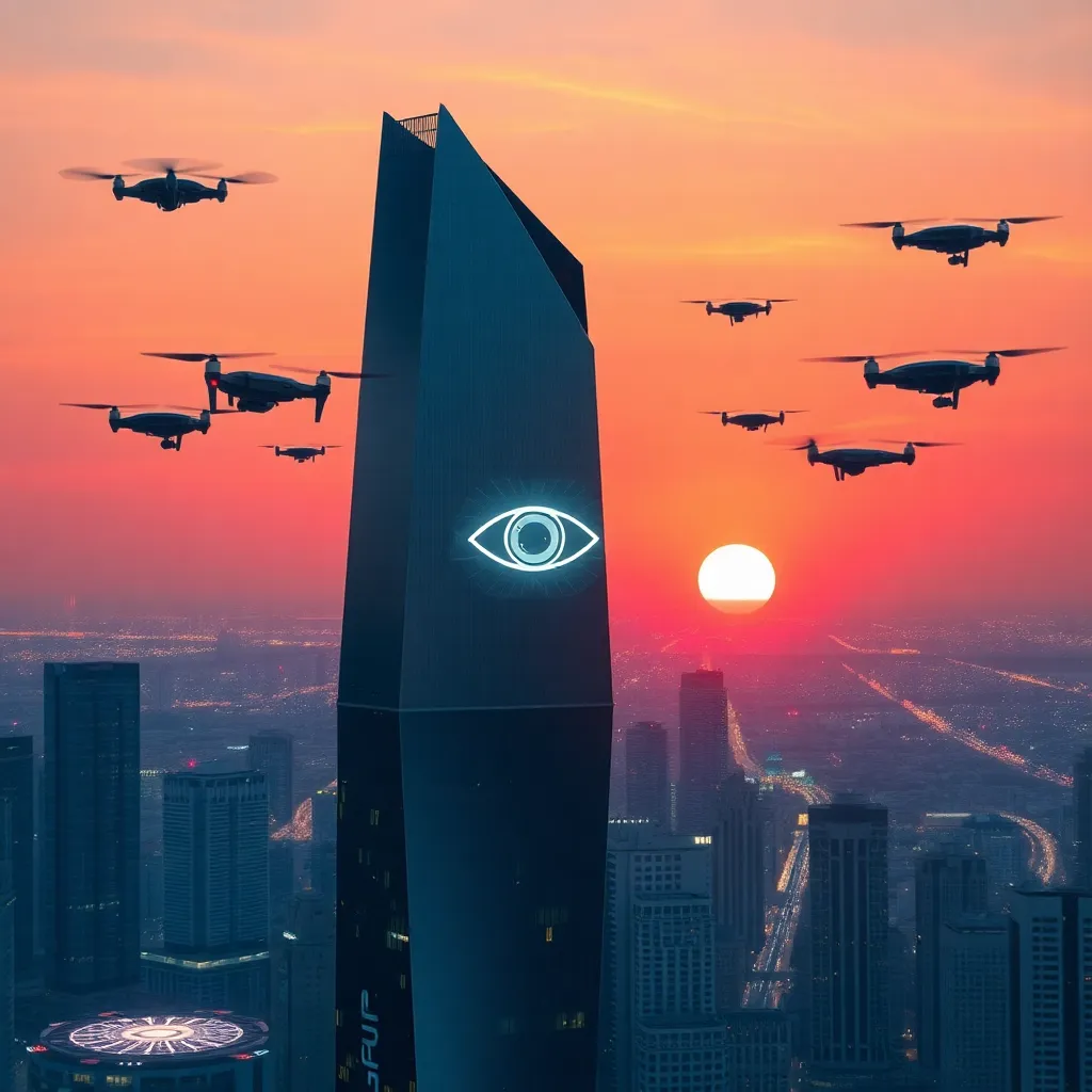 Create a futuristic cityscape at sunset, with a sleek, silver skyscraper in the foreground, surrounded by hovering drones and a vibrant, neon-lit cityscape in the background. Incorporate a subtle, glowing AI eye in the center of the skyscraper, symbolizing the intersection of technology and urban life.