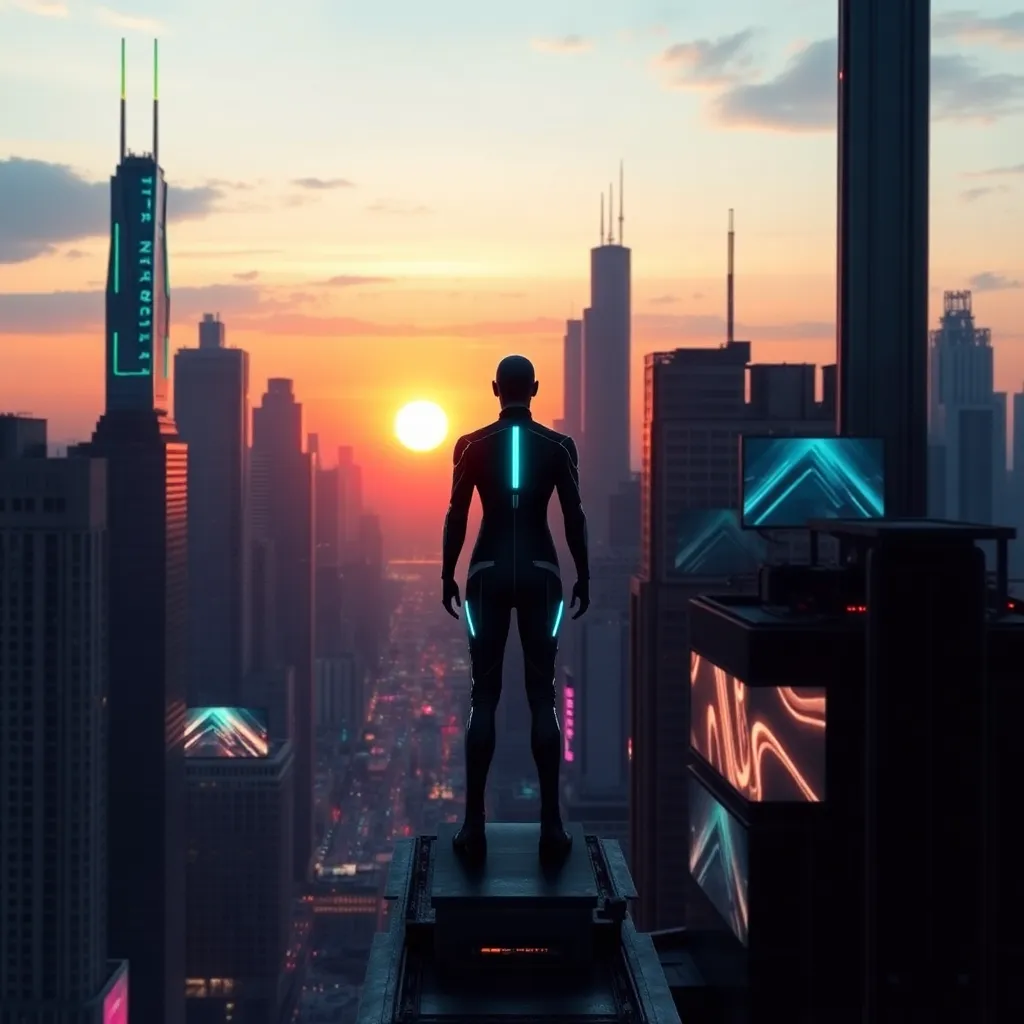 Create a futuristic cityscape at sunset, featuring a lone figure standing atop a skyscraper, gazing out at the city below. The figure should be dressed in a sleek, high-tech jumpsuit and have a subtle, glowing aura surrounding their body. Incorporate neon lights and holographic advertisements in the background.