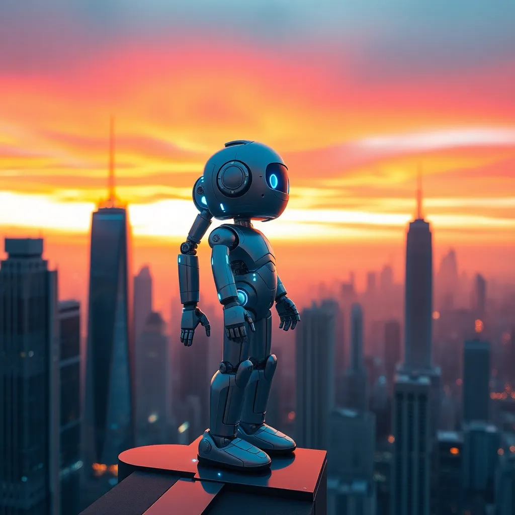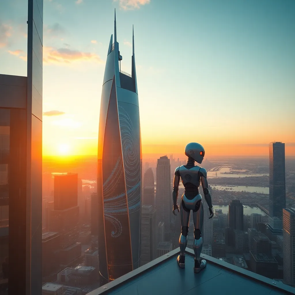 Create a futuristic cityscape at sunset with a sleek, silver skyscraper in the foreground and a holographic display projecting a vibrant, swirling pattern on its side. Incorporate a curious robot standing on the rooftop, looking out at the breathtaking view with a warm, golden glow illuminating its metallic body.
