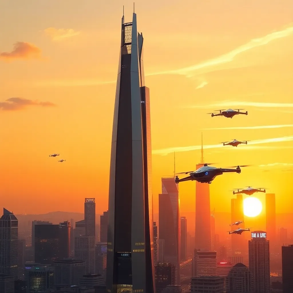 Create a futuristic cityscape at sunset, with a towering skyscraper in the center, surrounded by sleek, neon-lit buildings and hovering drones. In the foreground, a group of people in futuristic attire walk towards the camera, each with a unique hairstyle and outfit, with a subtle smile and a sense of wonder.