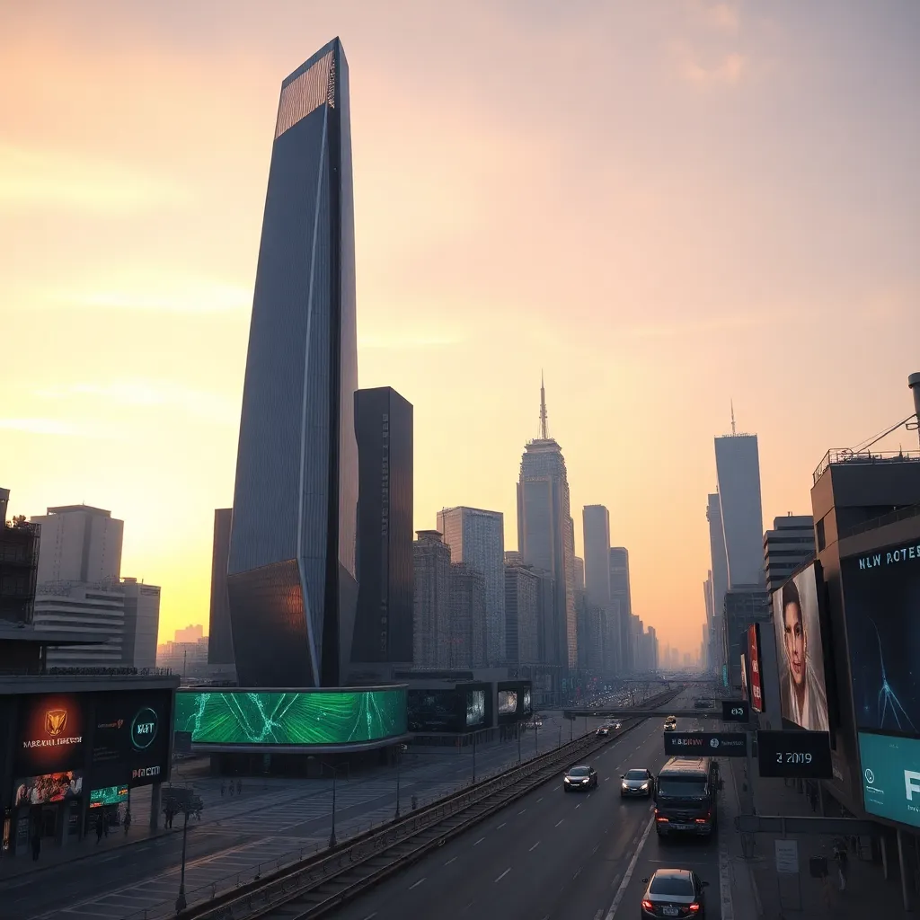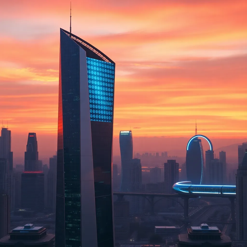 Create a futuristic cityscape at sunset, with a sleek, silver skyscraper in the foreground and a holographic billboard displaying a mesmerizing light show. In the distance, a hyperloop tube glows with an ethereal blue light. The sky is painted with hues of pink, orange, and purple. Incorporate AI-generated cityscapes.