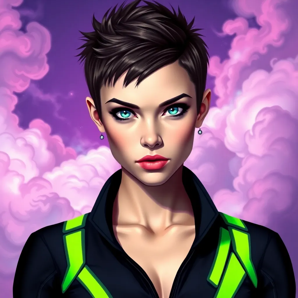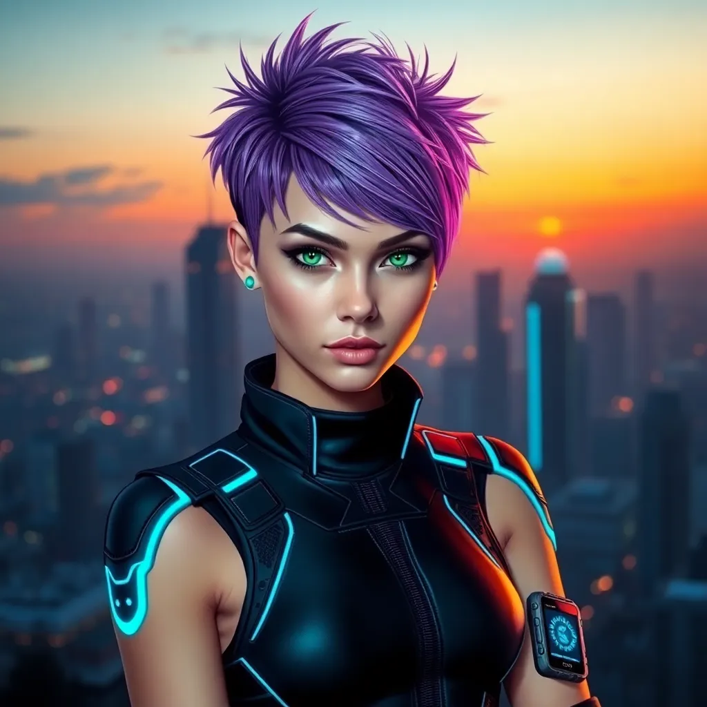 Create a futuristic self-portrait of a young woman with short, spiky purple hair and piercing green eyes. She's wearing a sleek black jumpsuit with neon blue accents and standing in front of a cityscape at sunset. Incorporate subtle cyberpunk elements, such as glowing circuits on her arms and a holographic display on her wrist.
