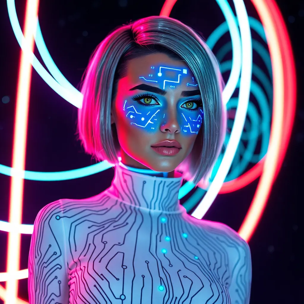 Create a futuristic AI selfie with a bold, neon-lit cityscape as the background. The AI subject should be a young woman with short, spiky hair and piercing blue eyes. She should be wearing a sleek, high-tech jumpsuit and have a confident, determined expression. Incorporate glowing circuitry and wires into her design.