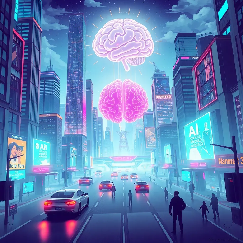 Create an illustration of a futuristic cityscape with towering skyscrapers, flying cars, and humans interacting with AI-powered robots. Incorporate neon lights, holographic advertisements, and a giant AI brain in the background. The image should convey a sense of innovation, progress, and harmony between humans and technology.