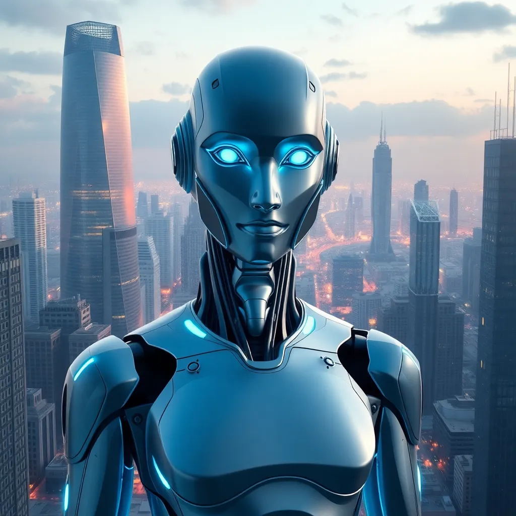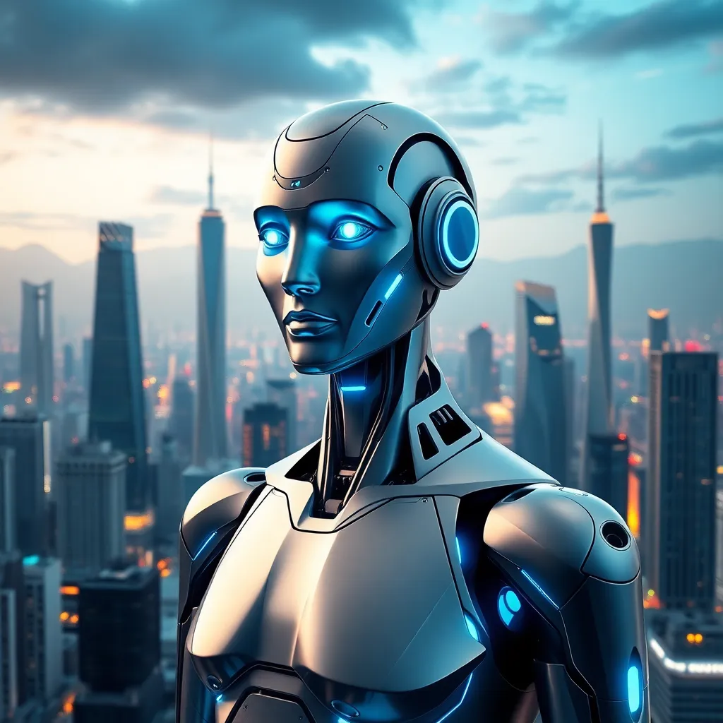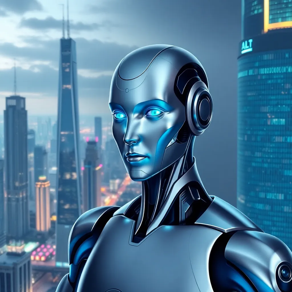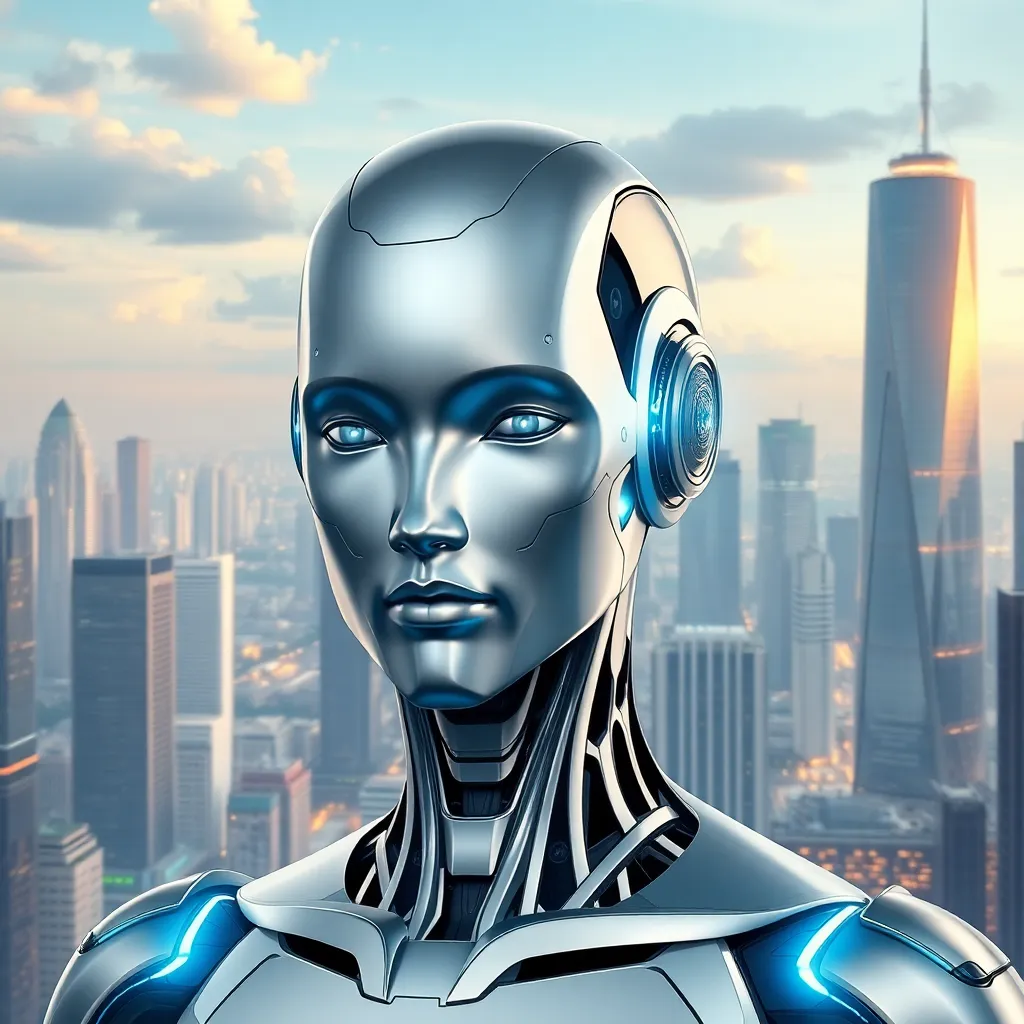 Imagine a futuristic cityscape with towering skyscrapers and a bustling metropolis. In the center, a humanoid AI robot stands tall, its metallic body glowing with a soft blue light. The robot's face is a seamless blend of human-like features and advanced technology, exuding confidence and innovation
