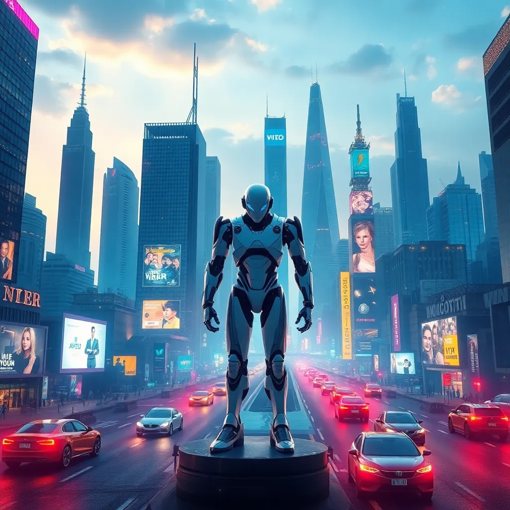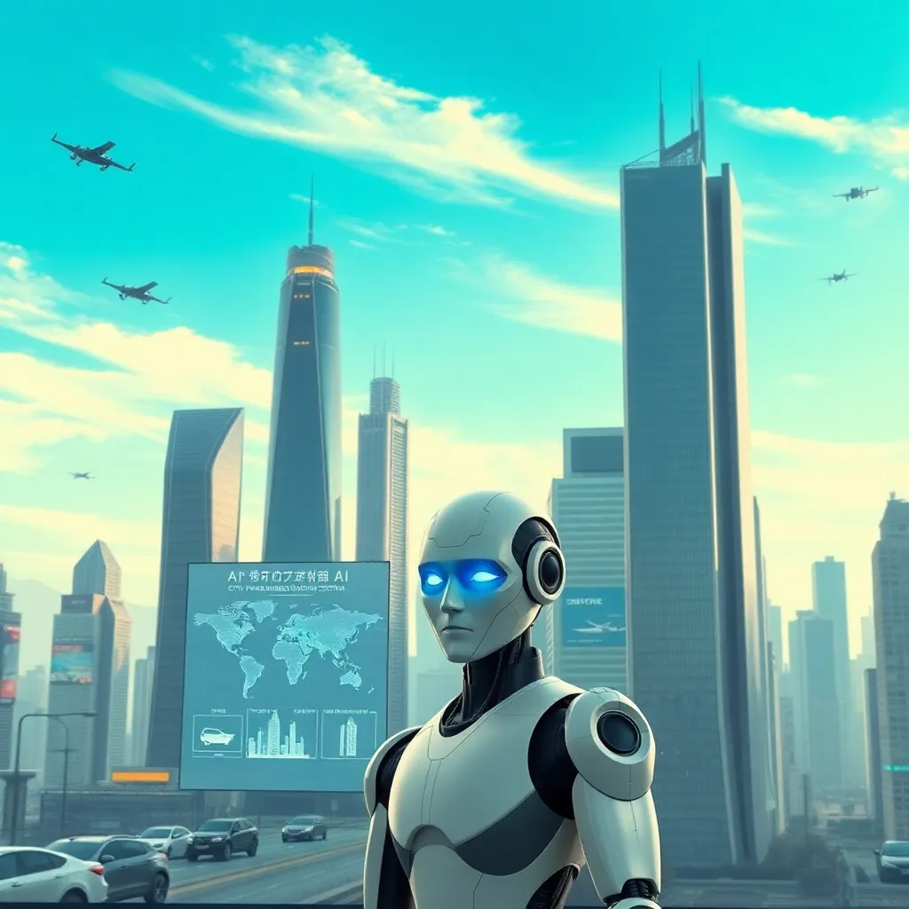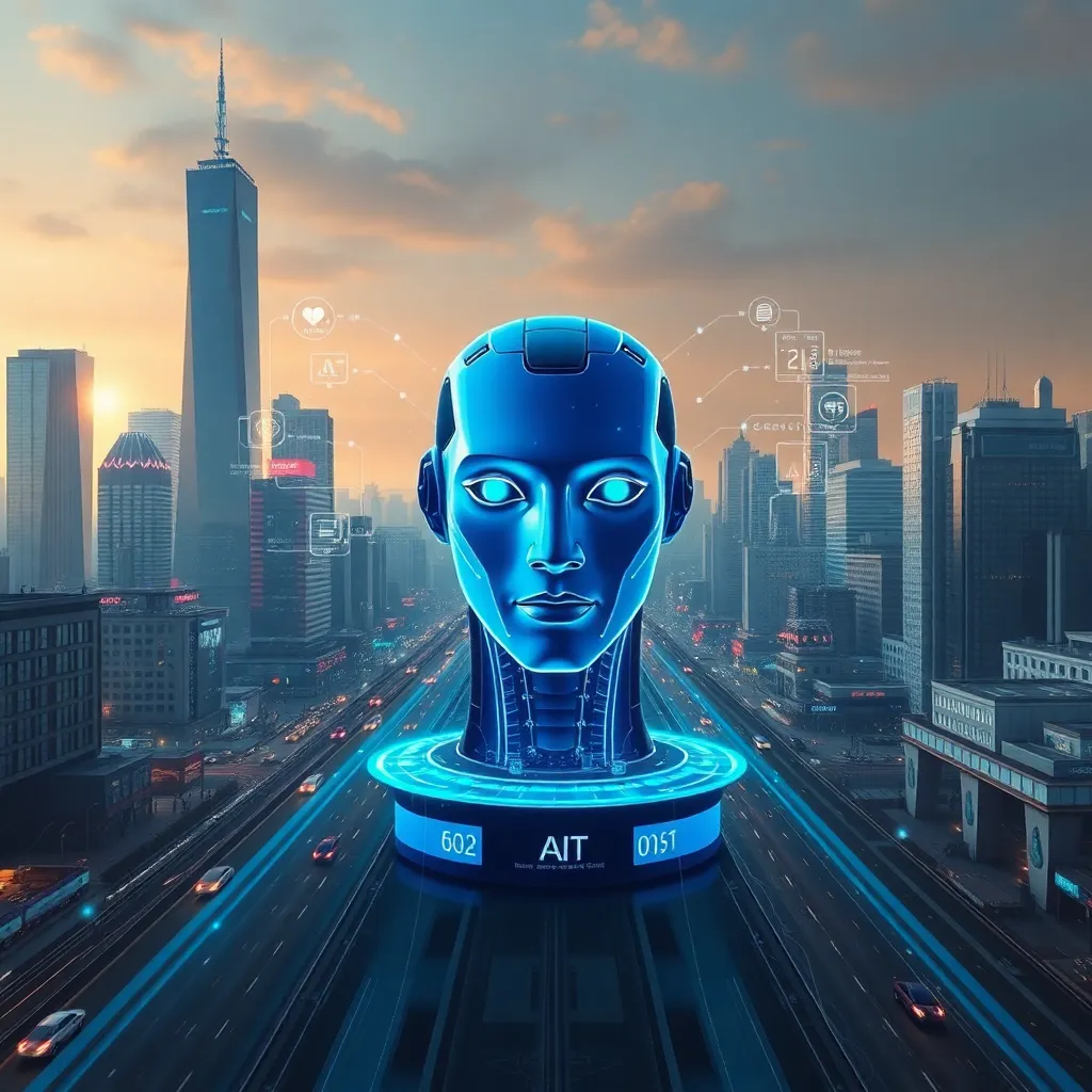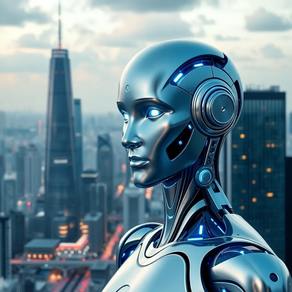 Imagine a futuristic cityscape with towering skyscrapers and a bustling metropolis. In the center, a humanoid AI robot stands tall, its metallic body glowing with a soft blue light. The robot's face is a seamless blend of human-like features and advanced technology, exuding confidence and innovation